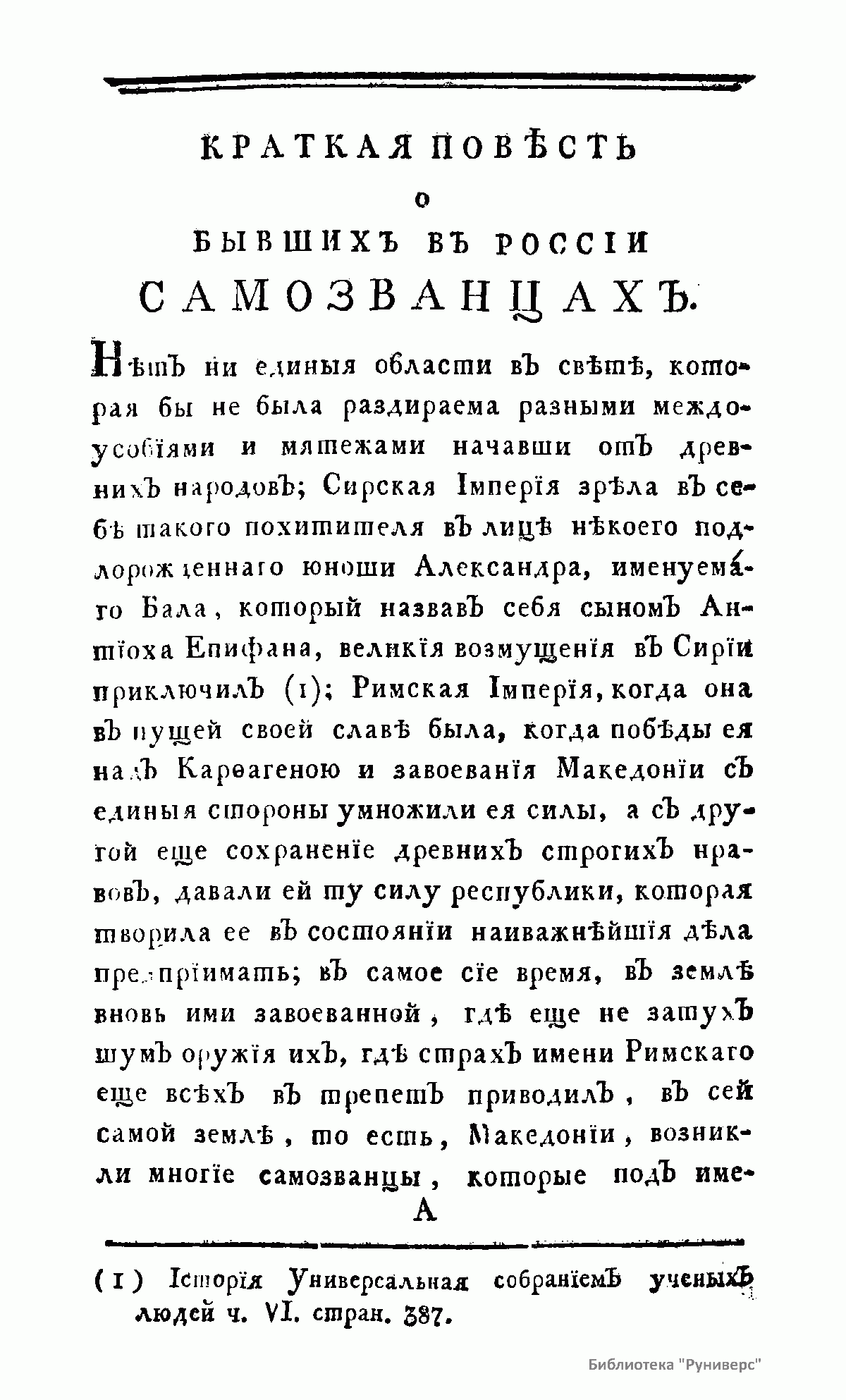 Самозванчество не представляет собой чисто русского явления, но ни в какой другой стране явление это не было столь частым и не играло бы столь значительной роли в истории русского народа. Историю России нельзя написать, обходя проблему самозванчества. По словам Ключевского, «у нас с легкой руки первого Лжедмитрия самозванство стало хронической болезнью государства: с тех пор чуть не до конца восемнадцатого века редкое царствование проходило без самозванца». Данное издание 1793 года не решает проблему самозванчества, но дает много выразительных подробностей о бывших в России самозванцах.
