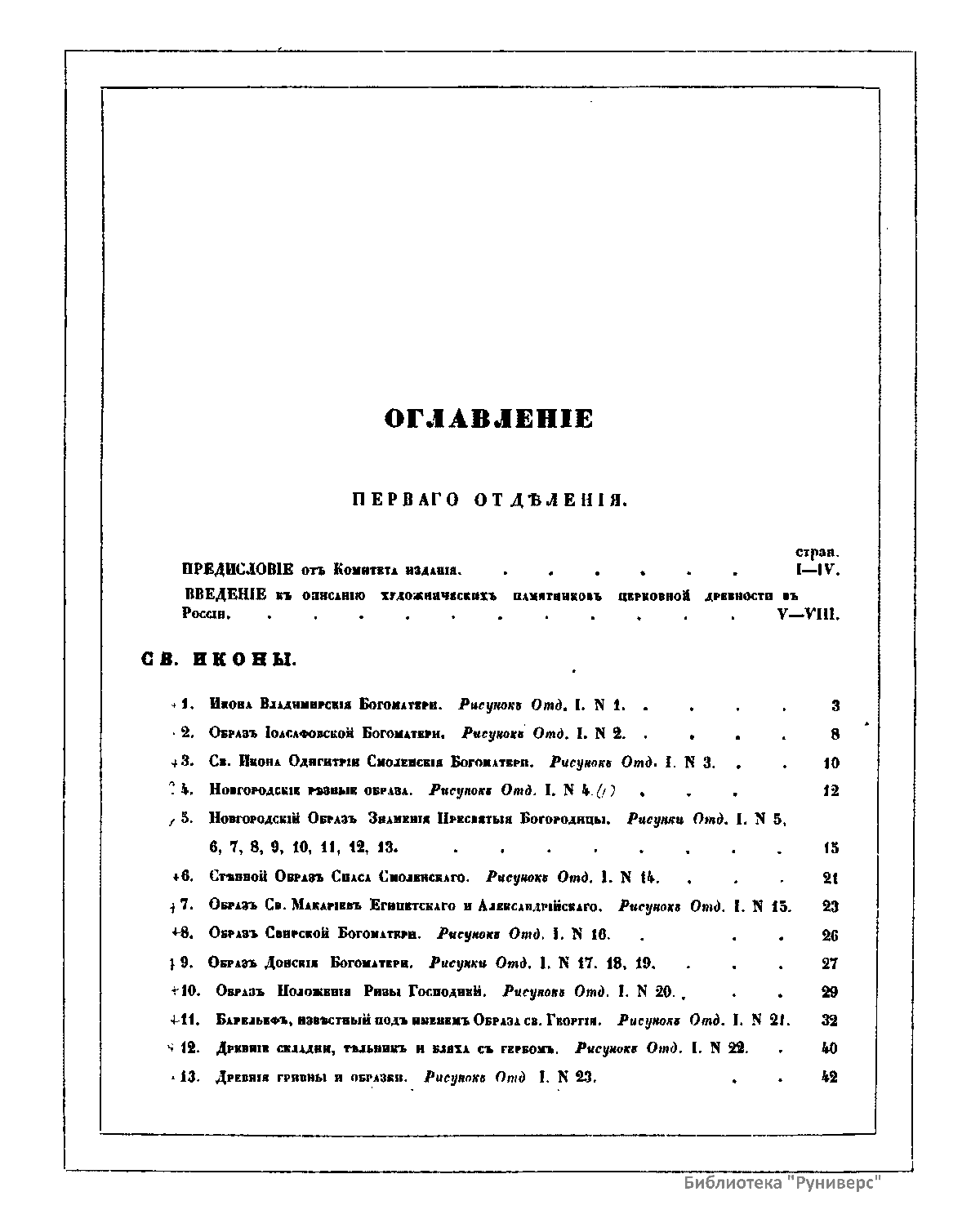 Авторы настоящего издания считают, что время охранения памятников России настало со вступления на престол Императора Николая I. Повелевая хранить памятники и остатки русских древностей, он приказал все, что заслуживает внимание и составляет материал истории, отчетливо срисовать, описать и издать. Император повелел учредить в Москве Комитет издания древностей Российского государства. Первый отдел огромного и великолепного издания «Древности Российского государства» состоит из 500 большого формата рисунков, распределенных по своему содержанию на шесть частей с соответствующим описанием. Первая часть «Древностей» заключает в себе священные памятники: а) образа и кресты, замечательные в историческом и художественном отношении, б) храмовую утварь разных времен, в) облачения духовного сана. Вторая часть содержит древний царский чин, или священное облачение русских великих князей и царей при поставлении на царство. В третьей части представлена древняя броня и оружие. Четвертую часть составляют древние великокняжеские, царские, боярские и местные народные одежды в изображениях и портретах. В пятой части можно увидеть древнюю царскую столовую утварь. Шестая часть состоит из памятников древнего русского зодчества.