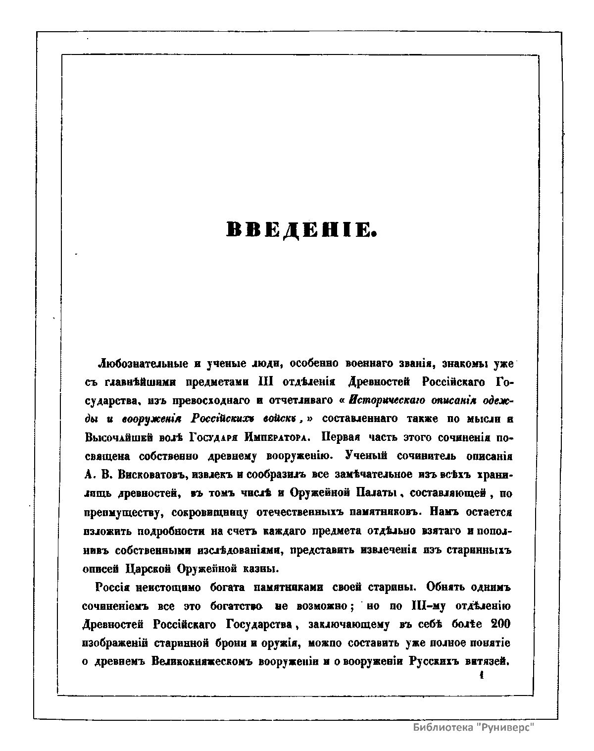 Авторы настоящего издания считают, что время охранения памятников России настало со вступления на престол Императора Николая I. Повелевая хранить памятники и остатки русских древностей, он приказал все, что заслуживает внимание и составляет материал истории, отчетливо срисовать, описать и издать. Император повелел учредить в Москве Комитет издания древностей Российского государства. Первый отдел огромного и великолепного издания «Древности Российского государства» состоит из 500 большого формата рисунков, распределенных по своему содержанию на шесть частей с соответствующим описанием. Первая часть «Древностей» заключает в себе священные памятники: а) образа и кресты, замечательные в историческом и художественном отношении, б) храмовую утварь разных времен, в) облачения духовного сана. Вторая часть содержит древний царский чин, или священное облачение русских великих князей и царей при поставлении на царство. В третьей части представлена древняя броня и оружие. Четвертую часть составляют древние великокняжеские, царские, боярские и местные народные одежды в изображениях и портретах. В пятой части можно увидеть древнюю царскую столовую утварь. Шестая часть состоит из памятников древнего русского зодчества.