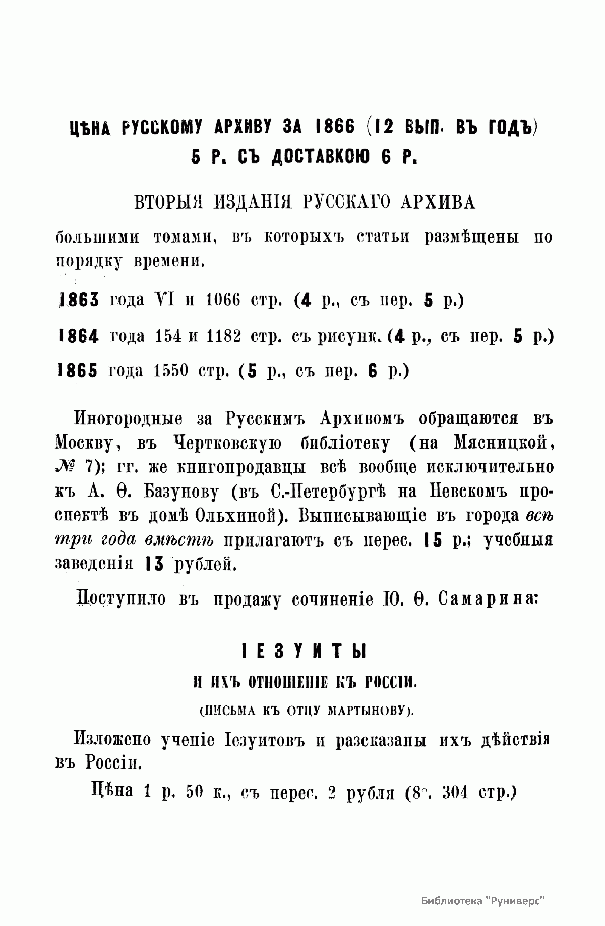 «Русский архив» — ежемесячный историко-литературный журнал, издававшийся в Москве с 1863 по 1917 год. Создателем и продолжительные годы редактором журнала был П. И. Бартенев – историк, археограф, библиограф. Этот журнал называли «живой картиной былого», поскольку он содержал преимущественно публикации неизданных мемуарных, эпистолярных, литературно-художественных и ведомственных документальных материалов, освещавших культурную и политическую историю России в XVIII и XIX вв. По числу опубликованных источников «Русский архив» стоит на первом месте среди русских исторических журналов.