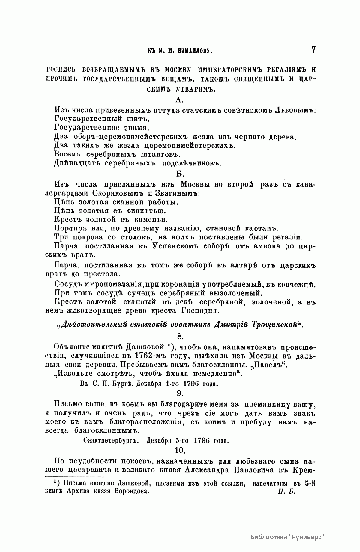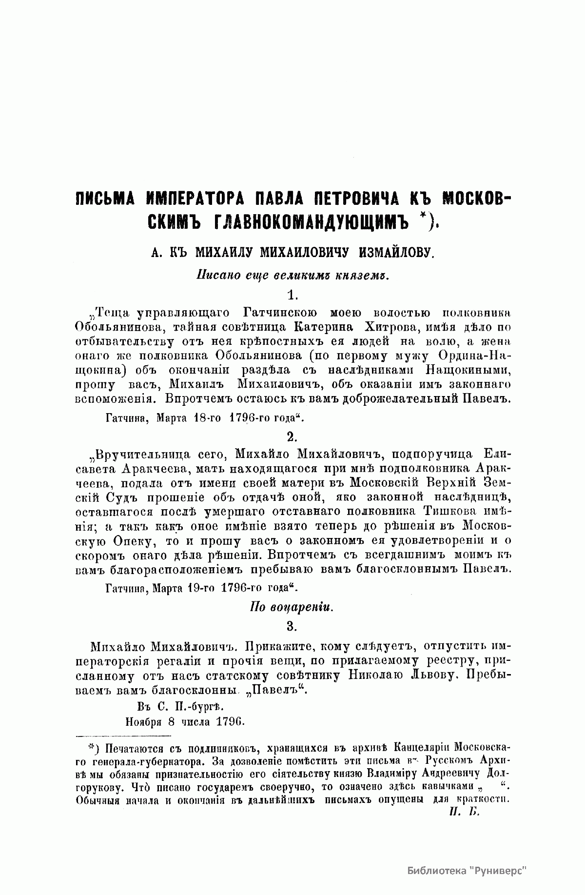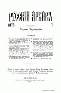 «Русский архив» — ежемесячный историко-литературный журнал, издававшийся в Москве с 1863 по 1917 год. Создателем и продолжительные годы редактором журнала был П. И. Бартенев – историк, археограф, библиограф. Этот журнал называли «живой картиной былого», поскольку он содержал преимущественно публикации неизданных мемуарных, эпистолярных, литературно-художественных и ведомственных документальных материалов, освещавших культурную и политическую историю России в XVIII и XIX вв. По числу опубликованных источников «Русский архив» стоит на первом месте среди русских исторических журналов.