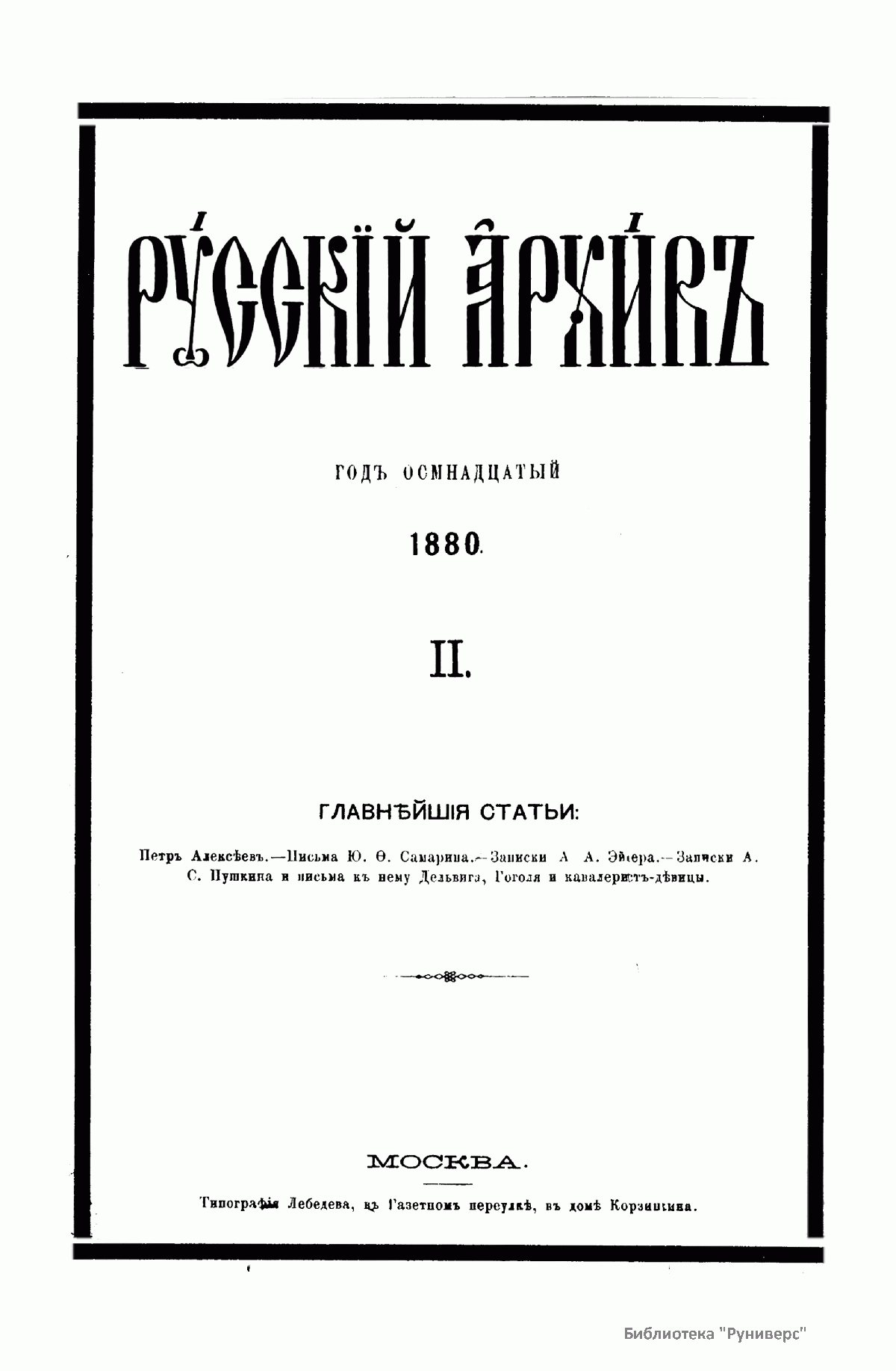 «Русский архив» — ежемесячный историко-литературный журнал, издававшийся в Москве с 1863 по 1917 год. Создателем и продолжительные годы редактором журнала был П. И. Бартенев – историк, археограф, библиограф. Этот журнал называли «живой картиной былого», поскольку он содержал преимущественно публикации неизданных мемуарных, эпистолярных, литературно-художественных и ведомственных документальных материалов, освещавших культурную и политическую историю России в XVIII и XIX вв. По числу опубликованных источников «Русский архив» стоит на первом месте среди русских исторических журналов.