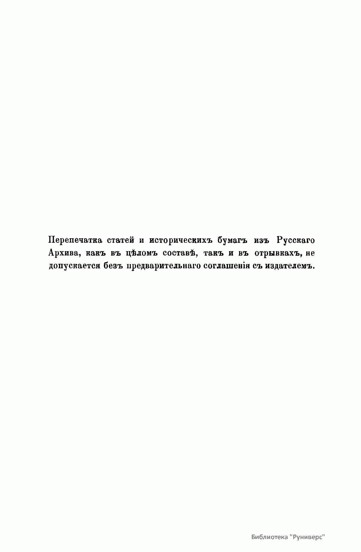«Русский архив» — ежемесячный историко-литературный журнал, издававшийся в Москве с 1863 по 1917 год. Создателем и продолжительные годы редактором журнала был П. И. Бартенев – историк, археограф, библиограф. Этот журнал называли «живой картиной былого», поскольку он содержал преимущественно публикации неизданных мемуарных, эпистолярных, литературно-художественных и ведомственных документальных материалов, освещавших культурную и политическую историю России в XVIII и XIX вв. По числу опубликованных источников «Русский архив» стоит на первом месте среди русских исторических журналов.
