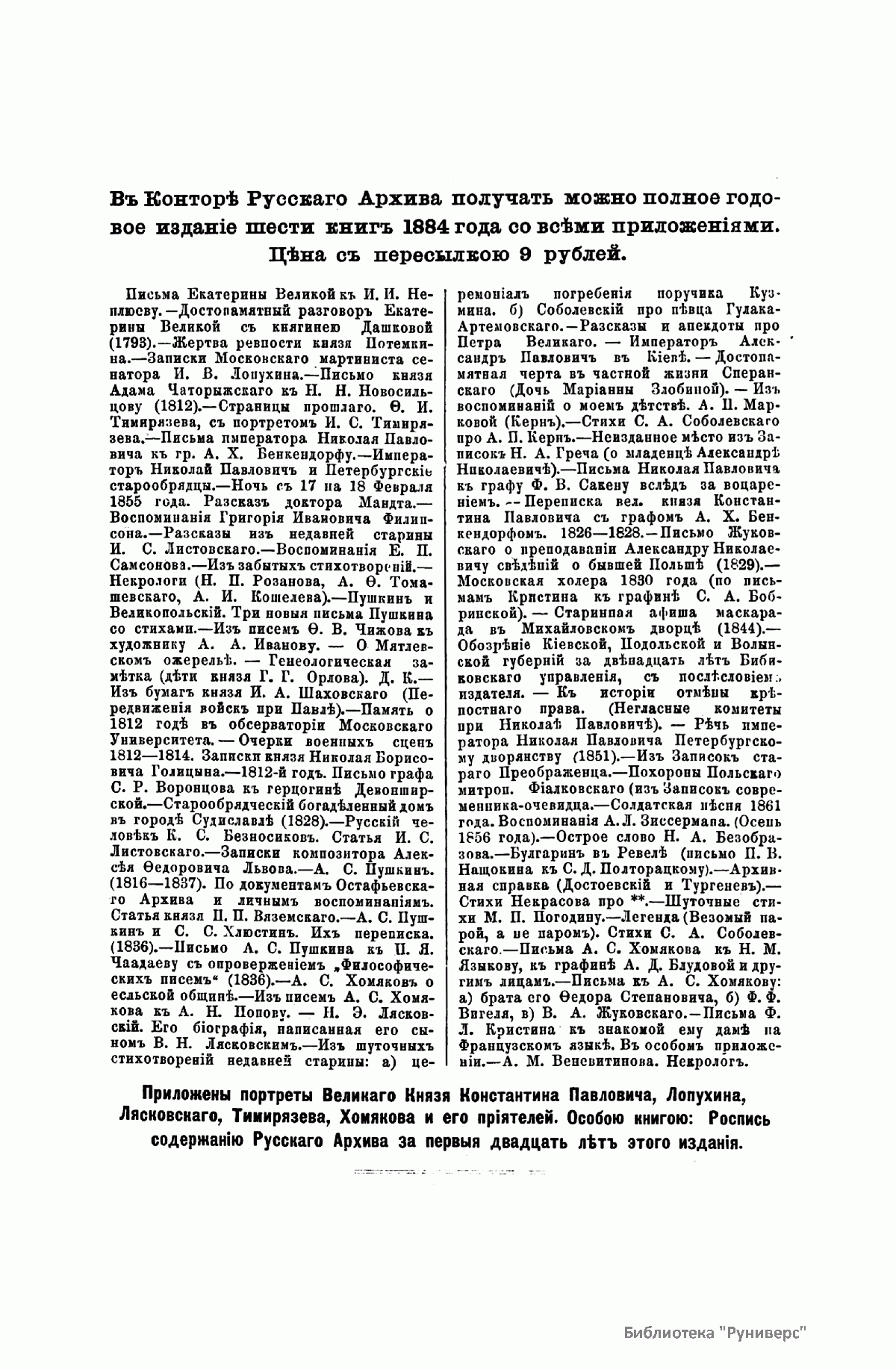 «Русский архив» — ежемесячный историко-литературный журнал, издававшийся в Москве с 1863 по 1917 год. Создателем и продолжительные годы редактором журнала был П. И. Бартенев – историк, археограф, библиограф. Этот журнал называли «живой картиной былого», поскольку он содержал преимущественно публикации неизданных мемуарных, эпистолярных, литературно-художественных и ведомственных документальных материалов, освещавших культурную и политическую историю России в XVIII и XIX вв. По числу опубликованных источников «Русский архив» стоит на первом месте среди русских исторических журналов.