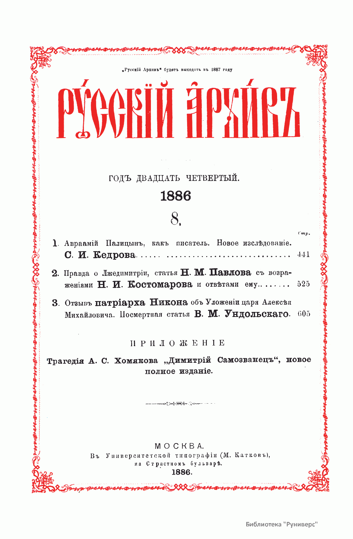 Русскiй архивъ. Историко-литературный сборникъ. 1886. Выпуски 8-12