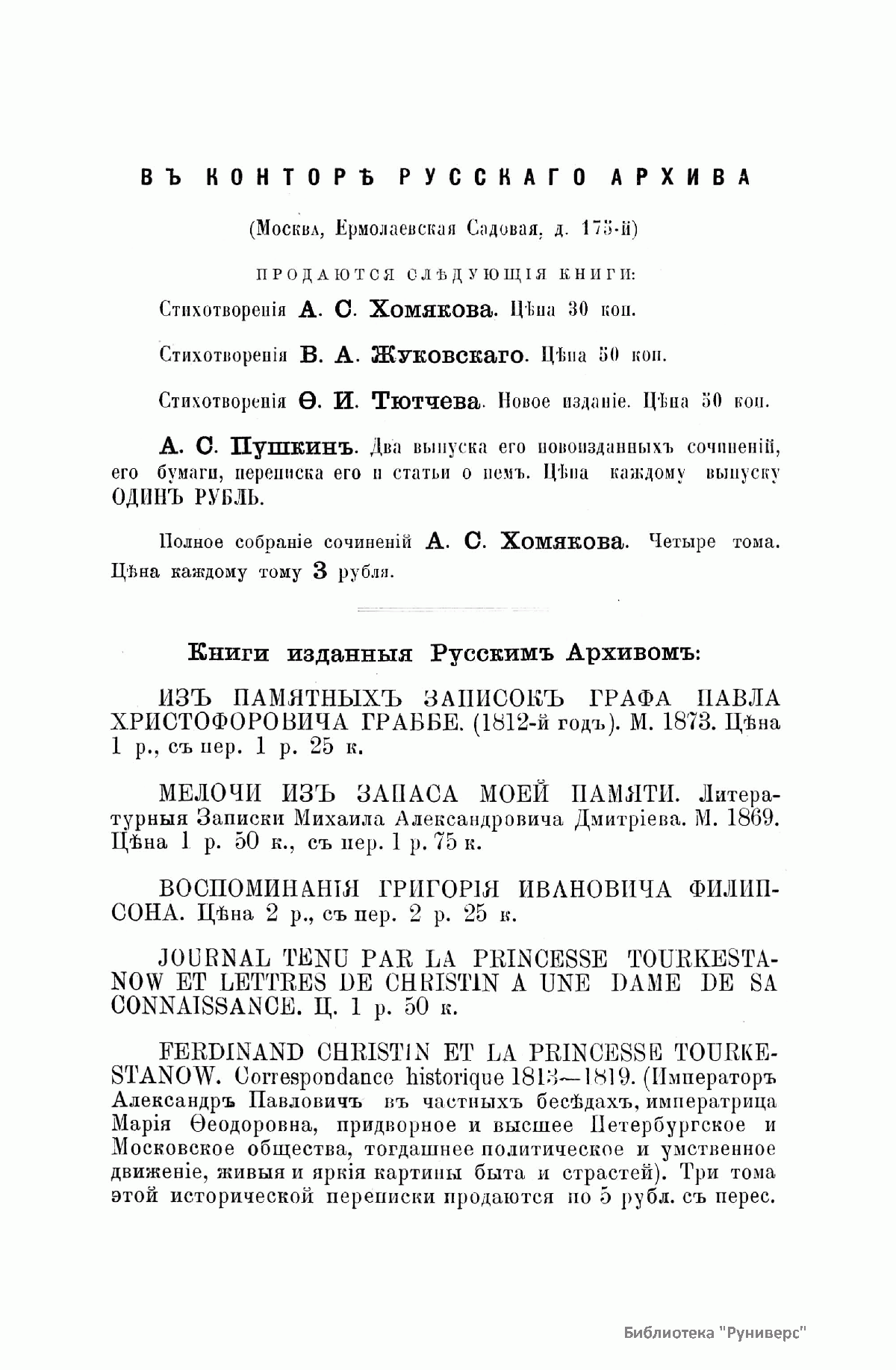 «Русский архив» — ежемесячный историко-литературный журнал, издававшийся в Москве с 1863 по 1917 год. Создателем и продолжительные годы редактором журнала был П. И. Бартенев – историк, археограф, библиограф. Этот журнал называли «живой картиной былого», поскольку он содержал преимущественно публикации неизданных мемуарных, эпистолярных, литературно-художественных и ведомственных документальных материалов, освещавших культурную и политическую историю России в XVIII и XIX вв. По числу опубликованных источников «Русский архив» стоит на первом месте среди русских исторических журналов.