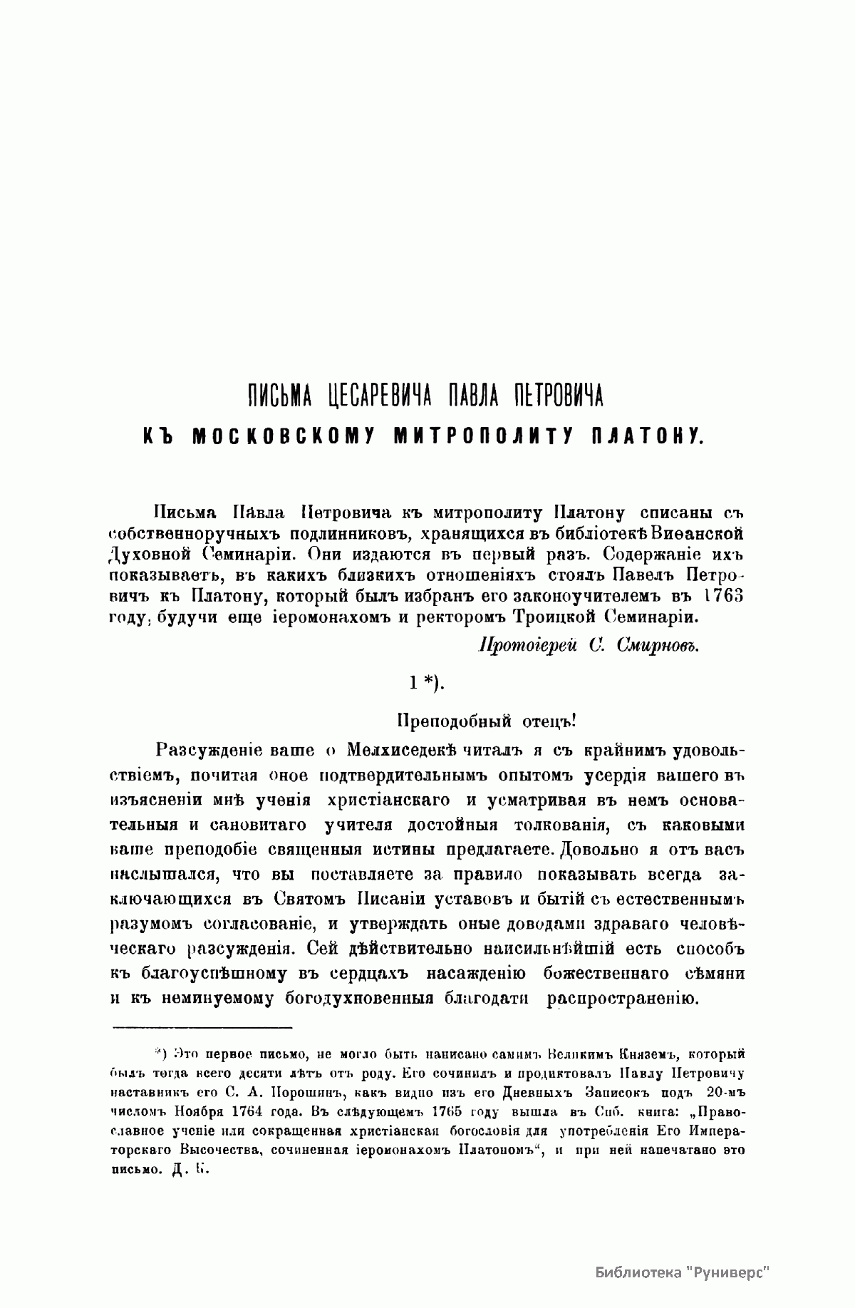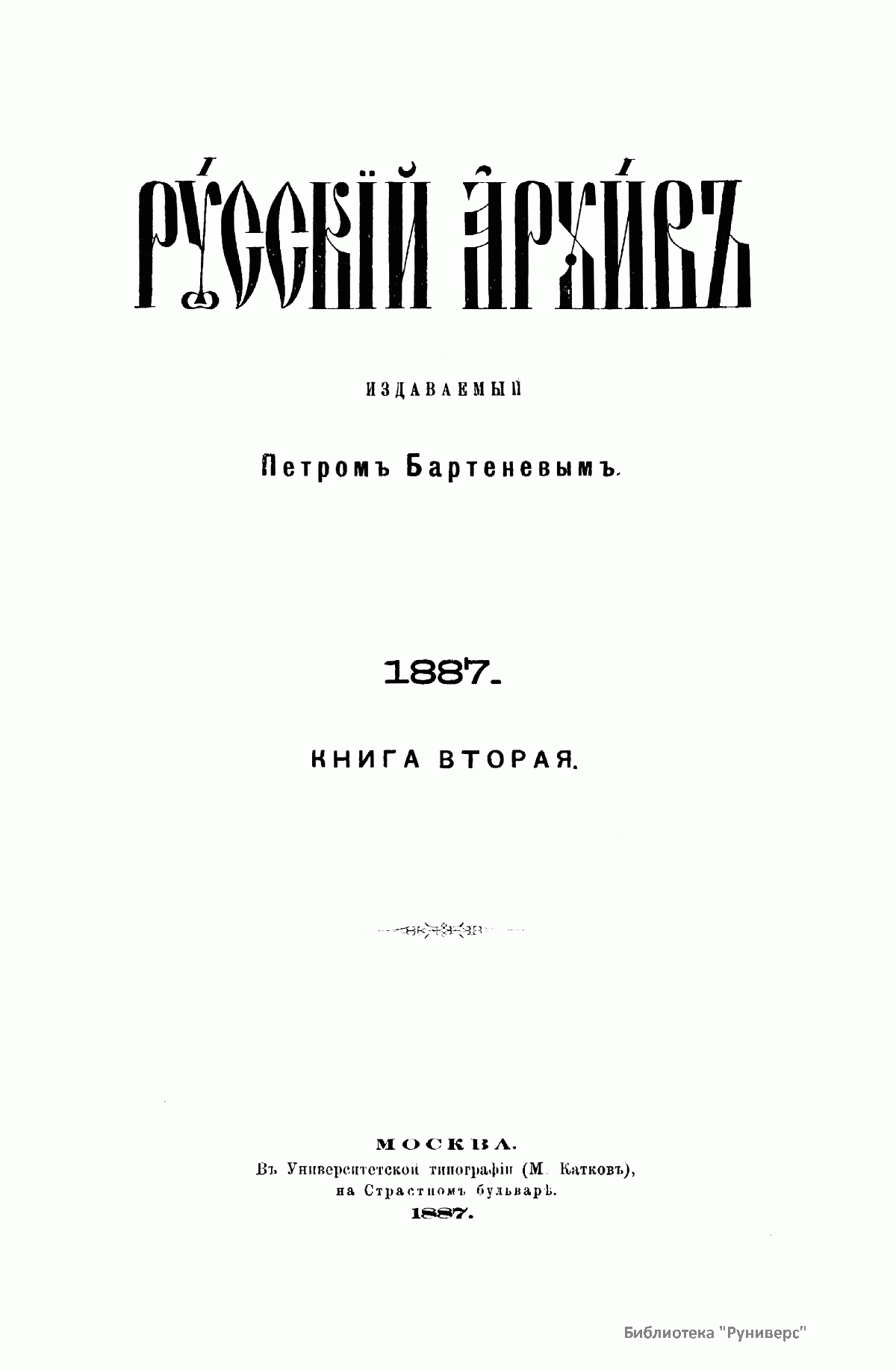 «Русский архив» — ежемесячный историко-литературный журнал, издававшийся в Москве с 1863 по 1917 год. Создателем и продолжительные годы редактором журнала был П. И. Бартенев – историк, археограф, библиограф. Этот журнал называли «живой картиной былого», поскольку он содержал преимущественно публикации неизданных мемуарных, эпистолярных, литературно-художественных и ведомственных документальных материалов, освещавших культурную и политическую историю России в XVIII и XIX вв. По числу опубликованных источников «Русский архив» стоит на первом месте среди русских исторических журналов.