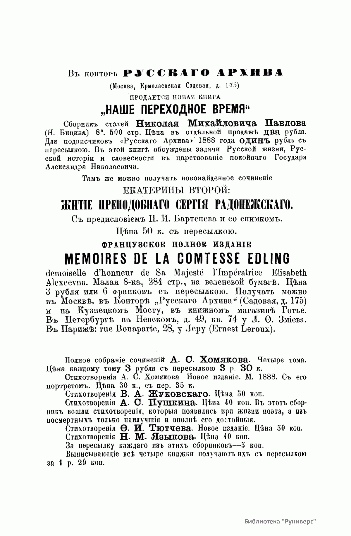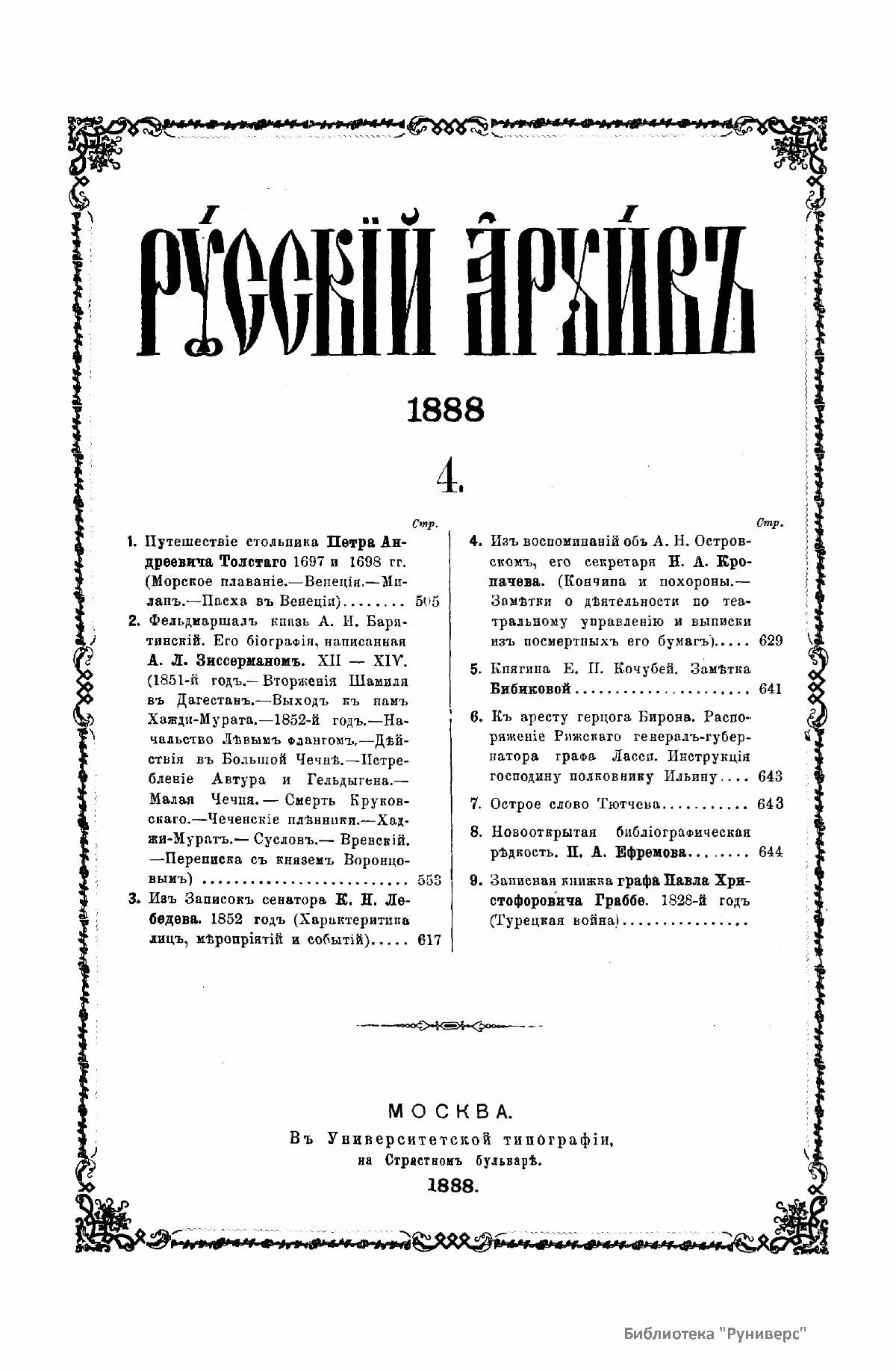 Русскiй архивъ. Историко-литературный сборникъ. 1888. Выпуски 4-8