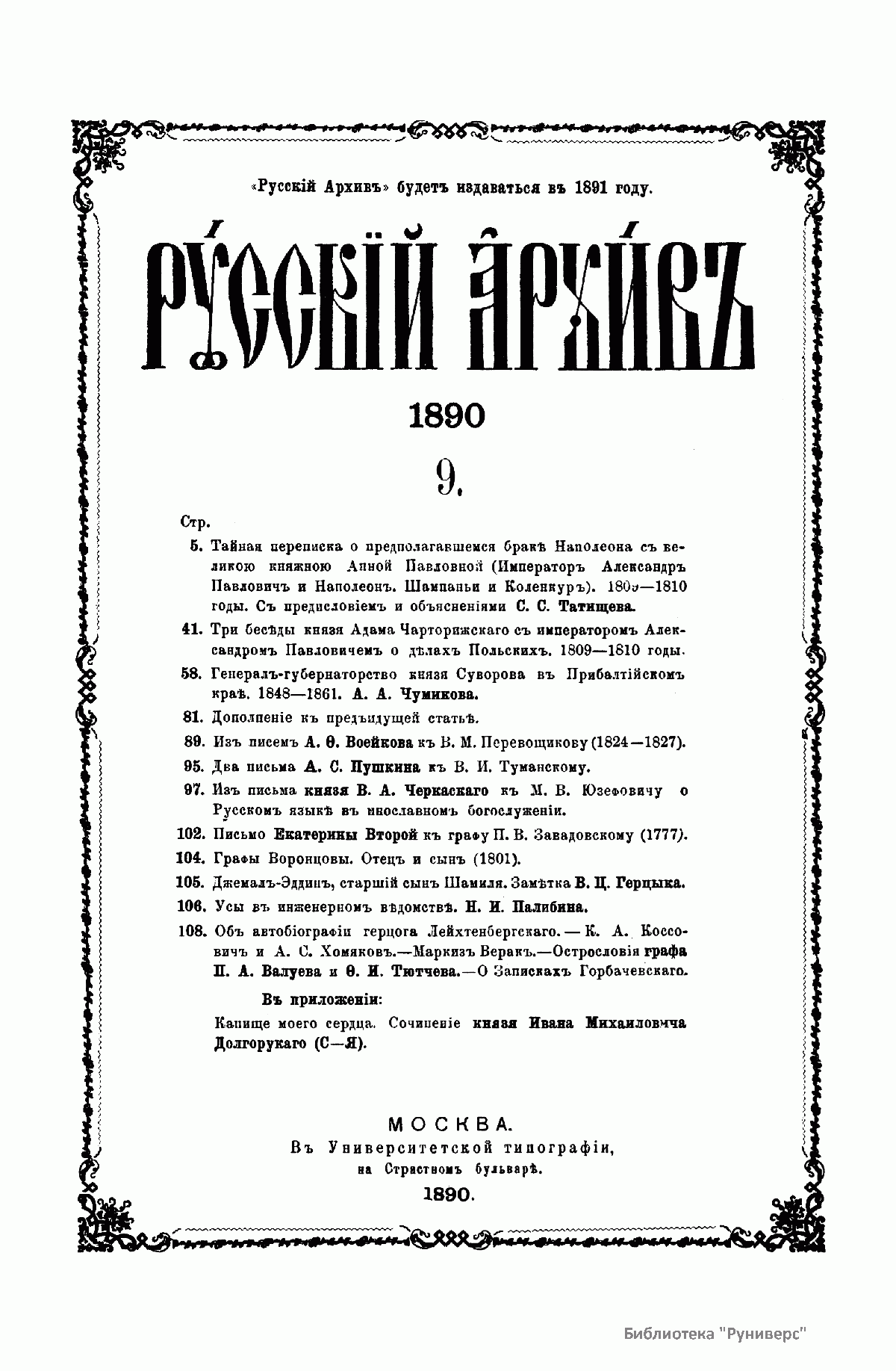 Русскiй архивъ. Историко-литературный сборникъ. 1890. Выпуски 9-12