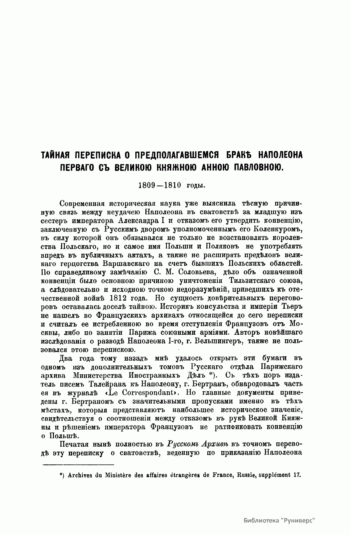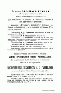 «Русский архив» — ежемесячный историко-литературный журнал, издававшийся в Москве с 1863 по 1917 год. Создателем и продолжительные годы редактором журнала был П. И. Бартенев – историк, археограф, библиограф. Этот журнал называли «живой картиной былого», поскольку он содержал преимущественно публикации неизданных мемуарных, эпистолярных, литературно-художественных и ведомственных документальных материалов, освещавших культурную и политическую историю России в XVIII и XIX вв. По числу опубликованных источников «Русский архив» стоит на первом месте среди русских исторических журналов.