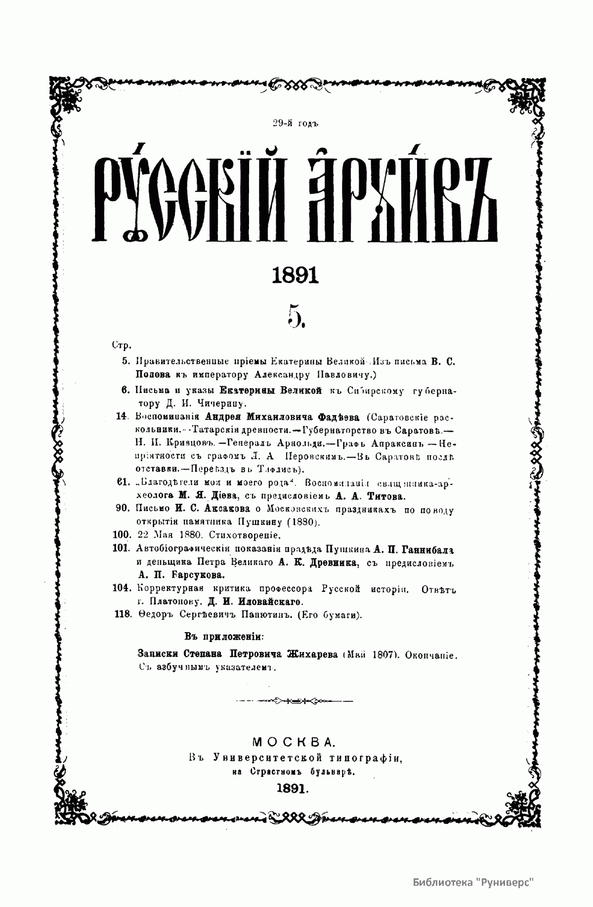 Русскiй архивъ. Историко-литературный сборникъ. 1891. Выпуски 5-8