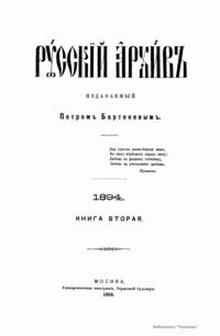 «Русский архив» — ежемесячный историко-литературный журнал, издававшийся в Москве с 1863 по 1917 год. Создателем и продолжительные годы редактором журнала был П. И. Бартенев – историк, археограф, библиограф. Этот журнал называли «живой картиной былого», поскольку он содержал преимущественно публикации неизданных мемуарных, эпистолярных, литературно-художественных и ведомственных документальных материалов, освещавших культурную и политическую историю России в XVIII и XIX вв. По числу опубликованных источников «Русский архив» стоит на первом месте среди русских исторических журналов.