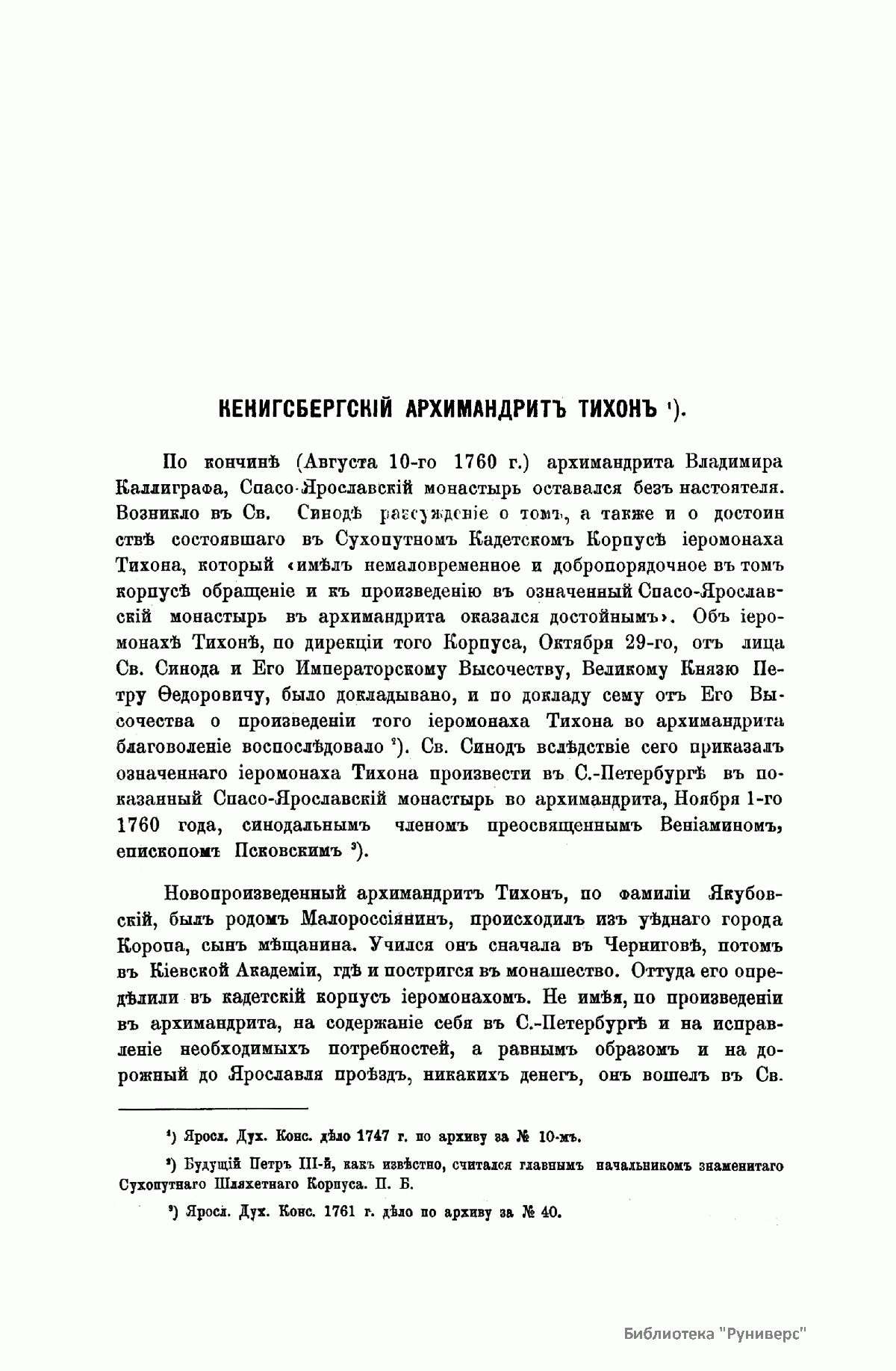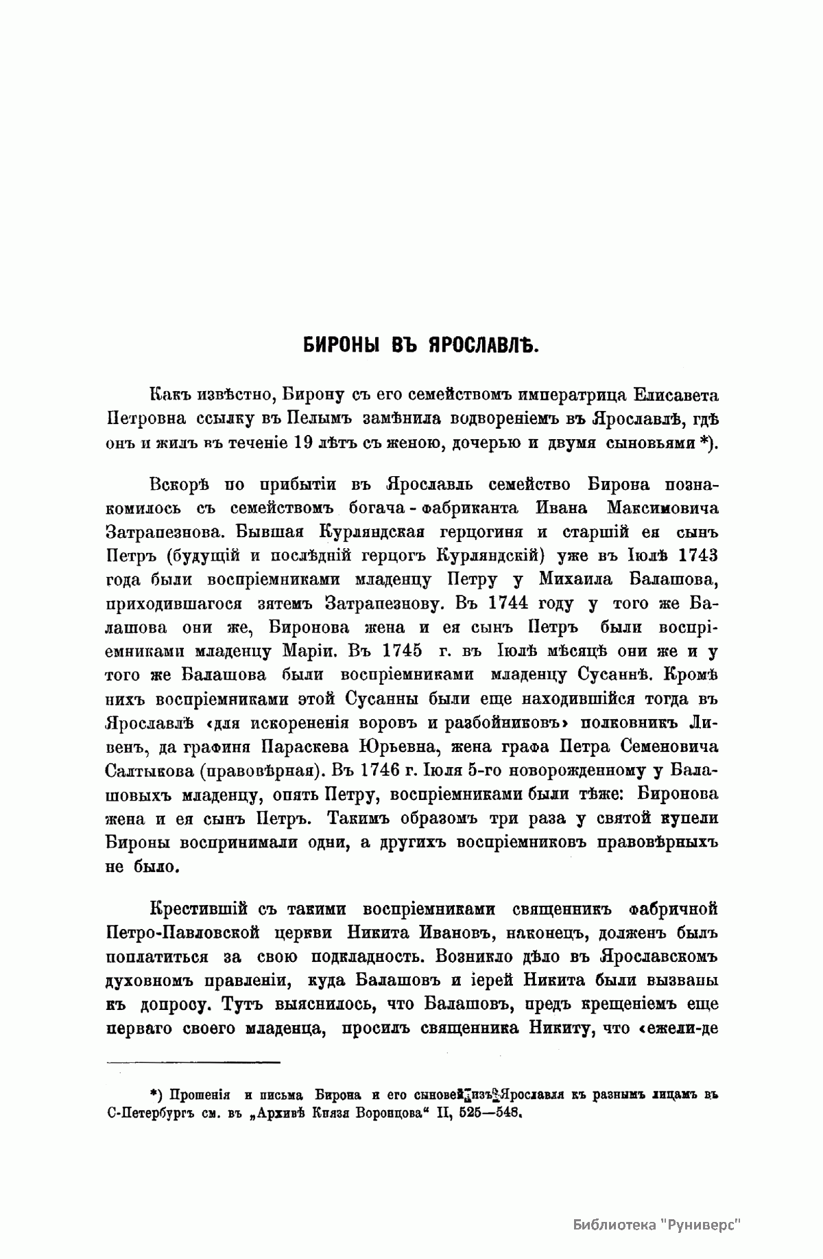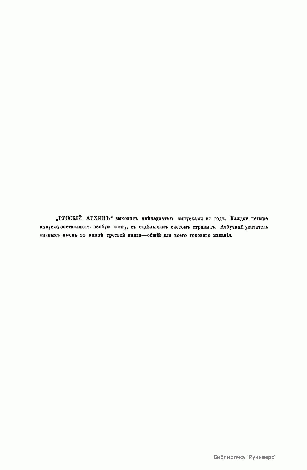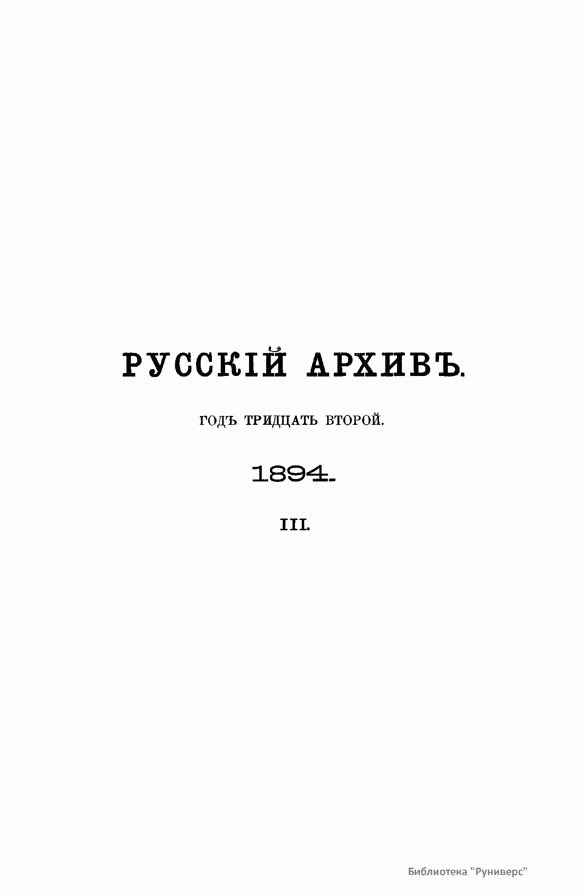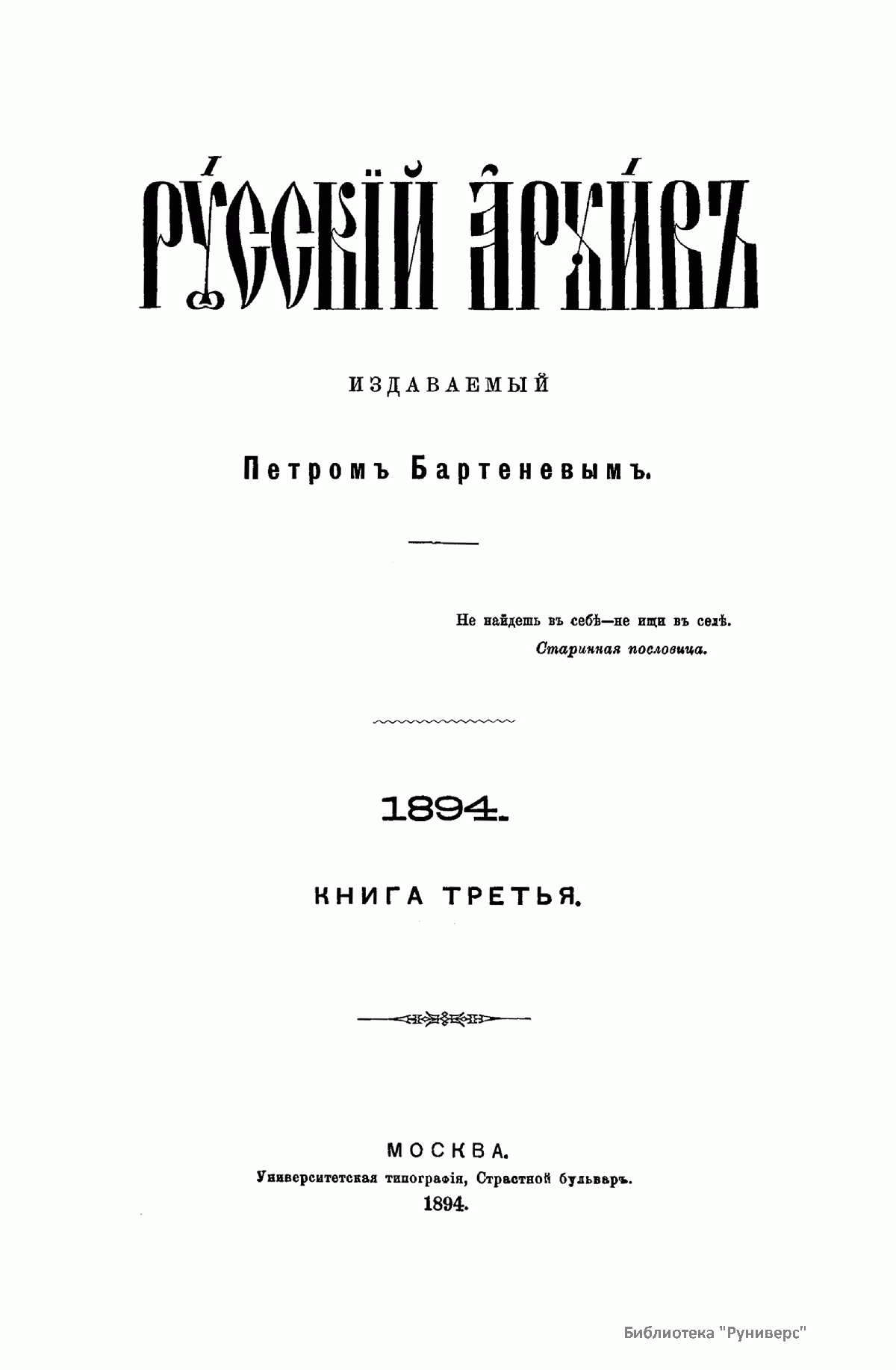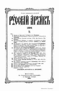 «Русский архив» — ежемесячный историко-литературный журнал, издававшийся в Москве с 1863 по 1917 год. Создателем и продолжительные годы редактором журнала был П. И. Бартенев – историк, археограф, библиограф. Этот журнал называли «живой картиной былого», поскольку он содержал преимущественно публикации неизданных мемуарных, эпистолярных, литературно-художественных и ведомственных документальных материалов, освещавших культурную и политическую историю России в XVIII и XIX вв. По числу опубликованных источников «Русский архив» стоит на первом месте среди русских исторических журналов.