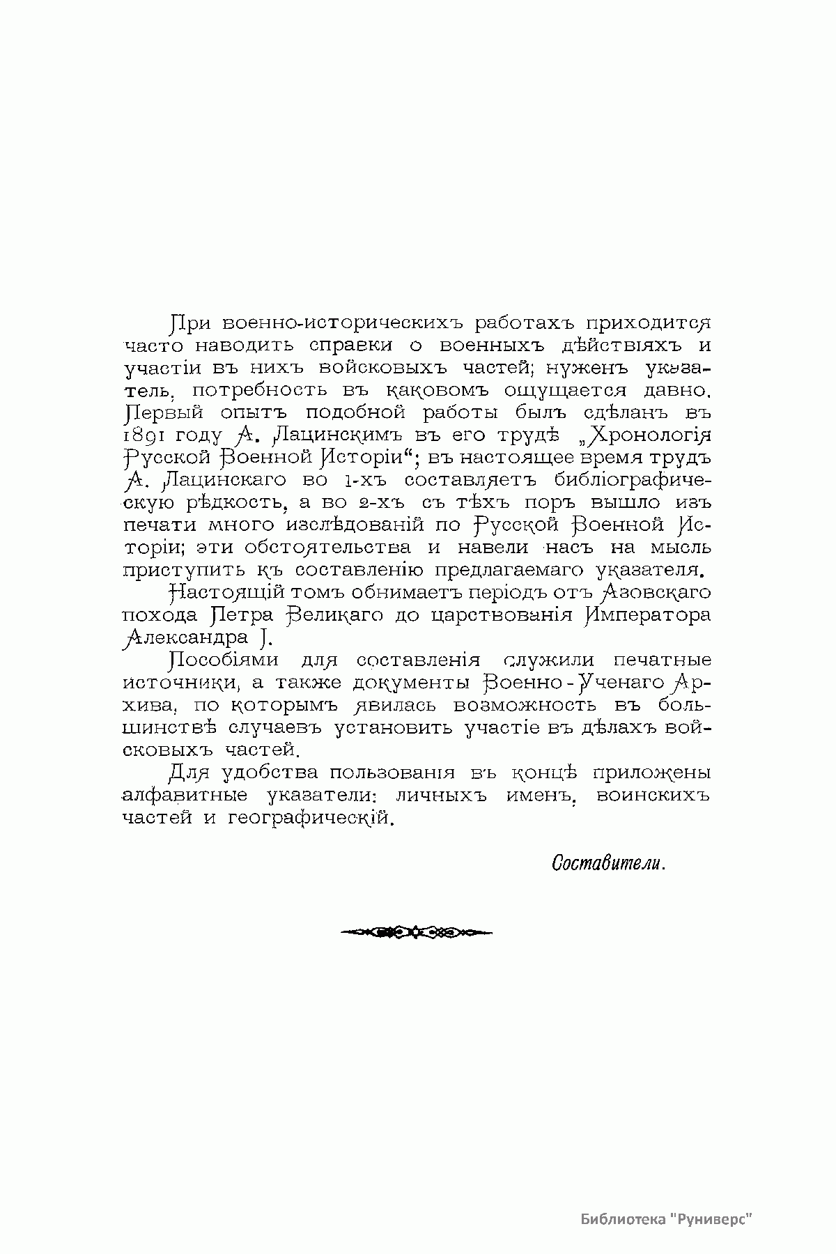 Подробный 5-томный справочник, изданный в 1908 – 1913 гг. коллективом авторов на основе фондов Военно-ученого архива Главного управления Генерального штаба (ныне Российский государственный военно-исторический архив), который содержит подробные сведения о боевых действиях русской армии и флота за период с 1695 г. (1-й Азовский поход) по 1905 г. (русско-японская война 1904 – 1905 гг.). В Справочнике приведены хронология событий, состав воинских соединений, включая наименования воинских подразделений (вплоть до отдельных рот и эскадронов), фамилии командиров, боевые потери и т.д.
