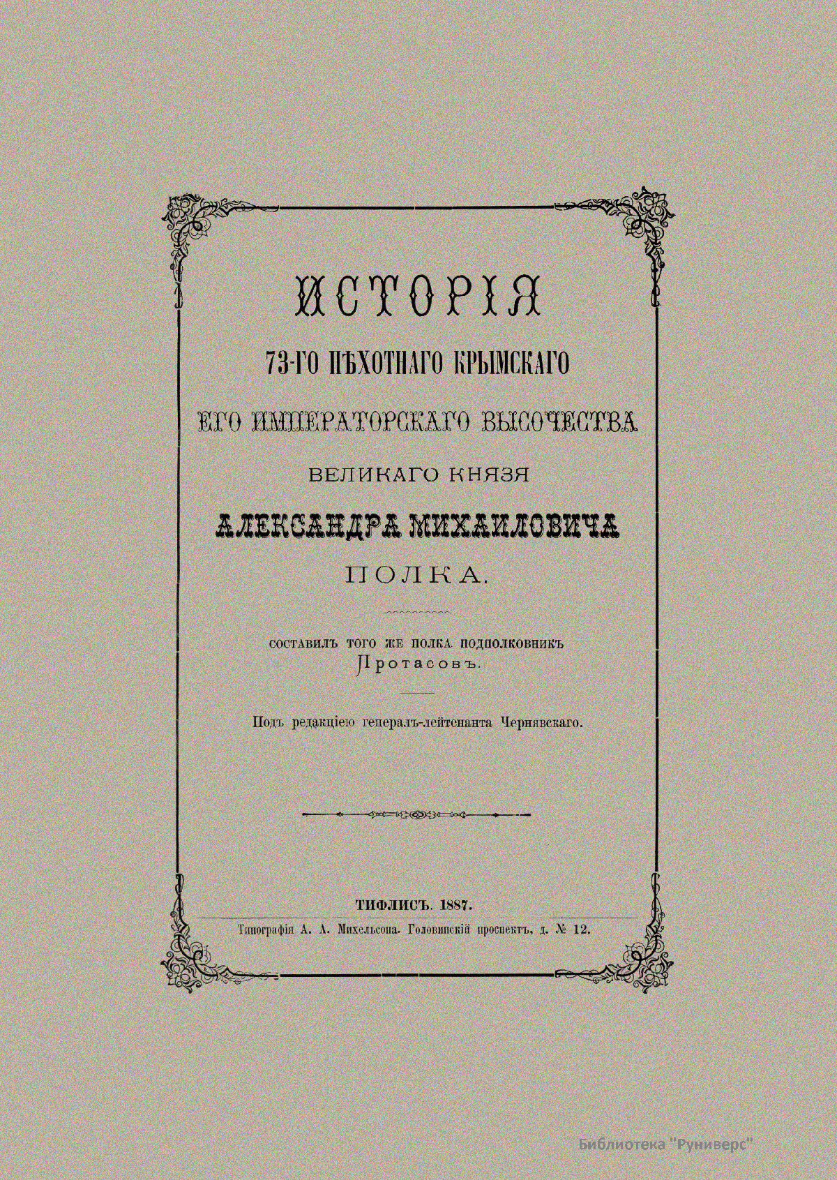 Исторiя 73-го пѣхотнаго крымскаго Его Императорскаго Высочества Великаго Князя Александра Михайловича полка