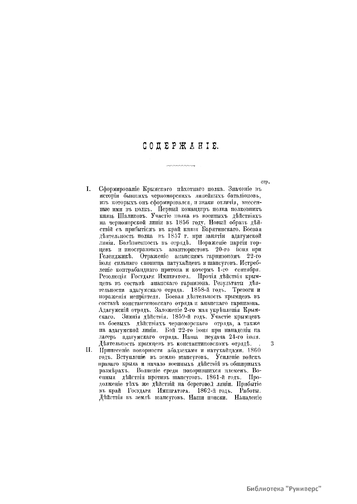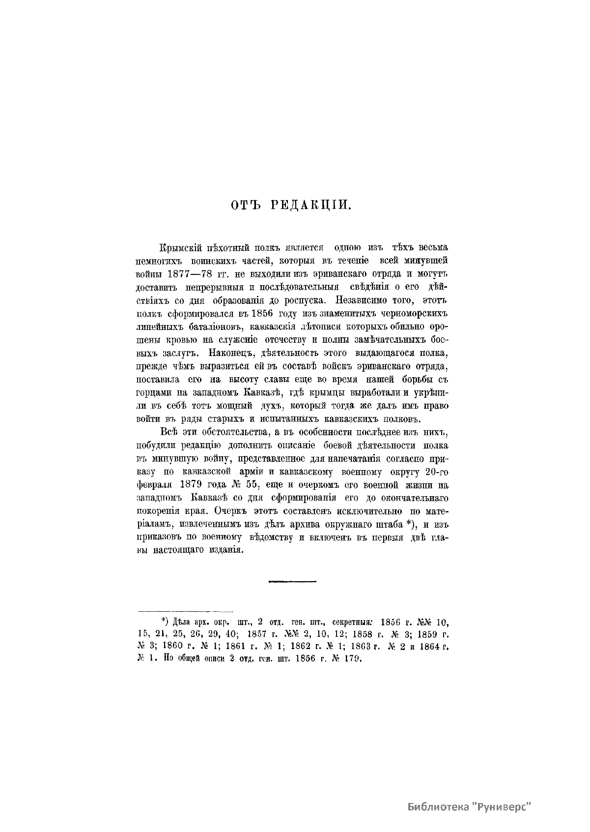 Книга описывает историю выдающегося Крымского пехотного полка. Крымский полк был сформирован на Кавказе 17 апреля 1856 г., в составе пяти Черноморских линейных батальонов. Уже с первых дней своего существования полк принял деятельное участие в тяжёлой борьбе с горцами на Черноморской береговой линии. Перед началом Русско-турецкой войны (1877–1878) полк был мобилизован и назначен в состав Эриванского отряда. Крымский пехотный полк принимал активное участие в боях при Драм-даге и освобождении Баязета, что было отмечено пожалованием всему полку знаков отличия за проявленное мужество в боях. После выхода первого издания 1887 г. появилось очень много статей с подробными описаниями действий Эриванского отряда в войну 1877–1878 гг., что побудило командира полка, полковника Карлстедта выпустить второе издание под редакцией М. Д. Протасова, значительно дополненное не только более подробными описаниями военных действий, но и портретами императоров. Автор книги подробно рассказывает о формировании Крымского пехотного полка, его назначении, устройстве, составе, дает представление о славных военных походах и характере службы. Текст сопровождается многочисленными портретами, а также картами с планами наиболее значимых боев и сражений.