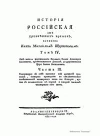 (также князю доверили разобрать и систематизировать архив Петра I). Начиная с 1770 г. вышло 7 томов, охватывающих историю России с древнейших времен до 1610 г. Следуя за идеями французских просветителей, Щербатов не только описывал действия исторических личностей, но и указывал, что за их поступками кроются определенные мысли, идеи, нравы, господствующие в обществе. И это было новым по отношению к предшествующей историографии.