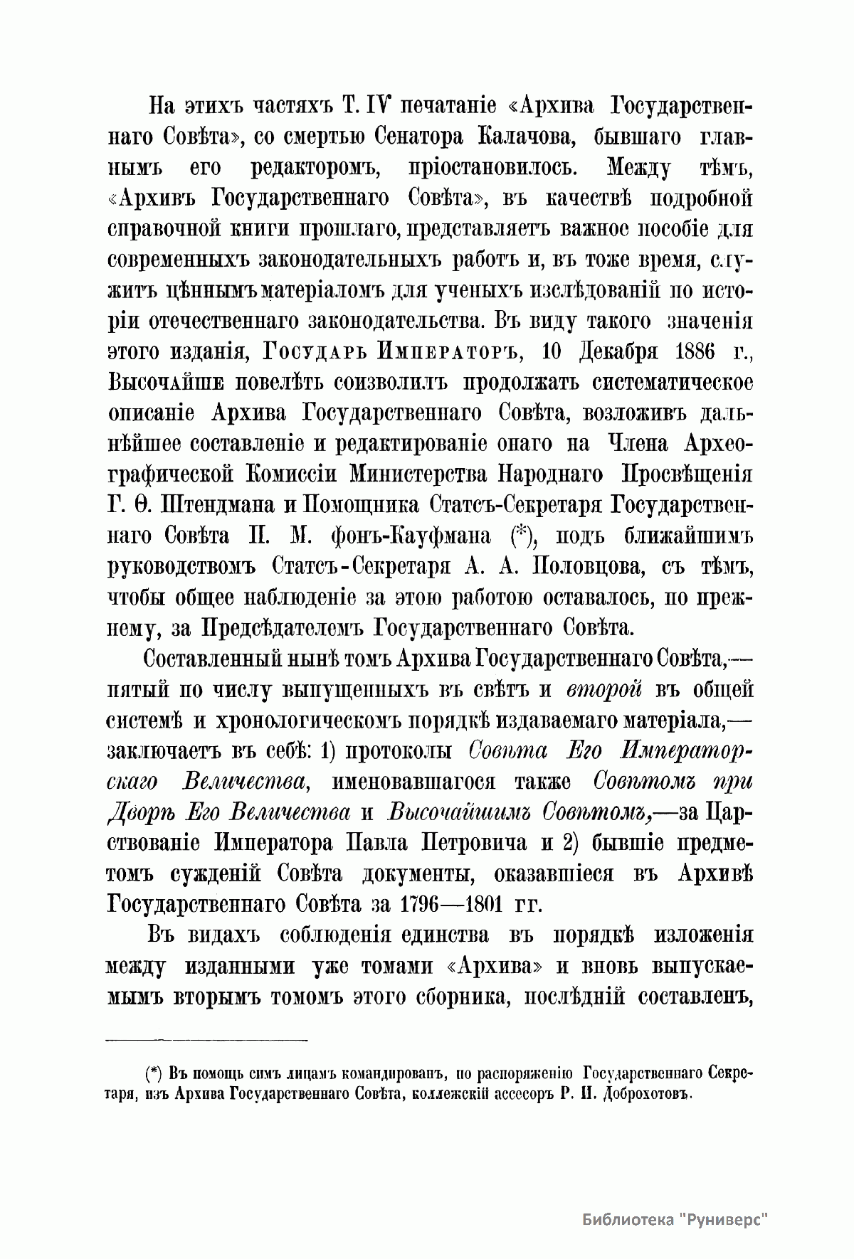 В 1863 г. по высочайшему повелению Александра II началась работа над систематическим описанием архива Государственного совета и Государственной канцелярии. Эта работа была поручена сенатору, историку-юристу Н. В. Калачову и советнику И. А. Чистовичу под высшим наблюдением председателя Государственного совета Д. Н. Блудова. Под их редактурой вышли в свет три тома (восемь книг) «Архива государственного совета»: две части первого тома, охватывающие период с 1768 по 1796 г. и заключающие в себе протоколы Совета, учрежденного императрицей Екатериной II; две части четвертого тома, содержащие журналы Государственного совета по Департаменту законов с 1810 по 1825 г.; две части третьего тома, в которые вошли протоколы Совета при Высочайшем дворе с 1801 по 1810 г.; две части четвертого тома, включающие журналы Государственного совета по Департаменту экономии с 1810 по 1825 г. Со смертью главного редактора издания сенатора Калачова публикация архива была приостановлена. С учетом исторической ценности данного труда, в 1886 г. последовало высочайшее повеление продолжить работу над изданием. Его составление и редактирование было возложено на члена Археографической комиссии Министерства народного просвещения Г. Ф. Штендмана, помощника статс-секретаря Государственного совета П. М. фон Кауфмана и др. В продолжение работы над изданием были опубликованы: третья часть четвертого тома, содержащая материалы по гражданскому отделению Департамента законов (1818–1820); пять частей четвертого тома, в который вошли журналы по Департаменту гражданских и духовных дел (1810 – 19 ноября 1825 г.); первая часть пятого тома, включающая журналы по делам Департамента государственной экономии (20 ноября 1825 г. – 1826).