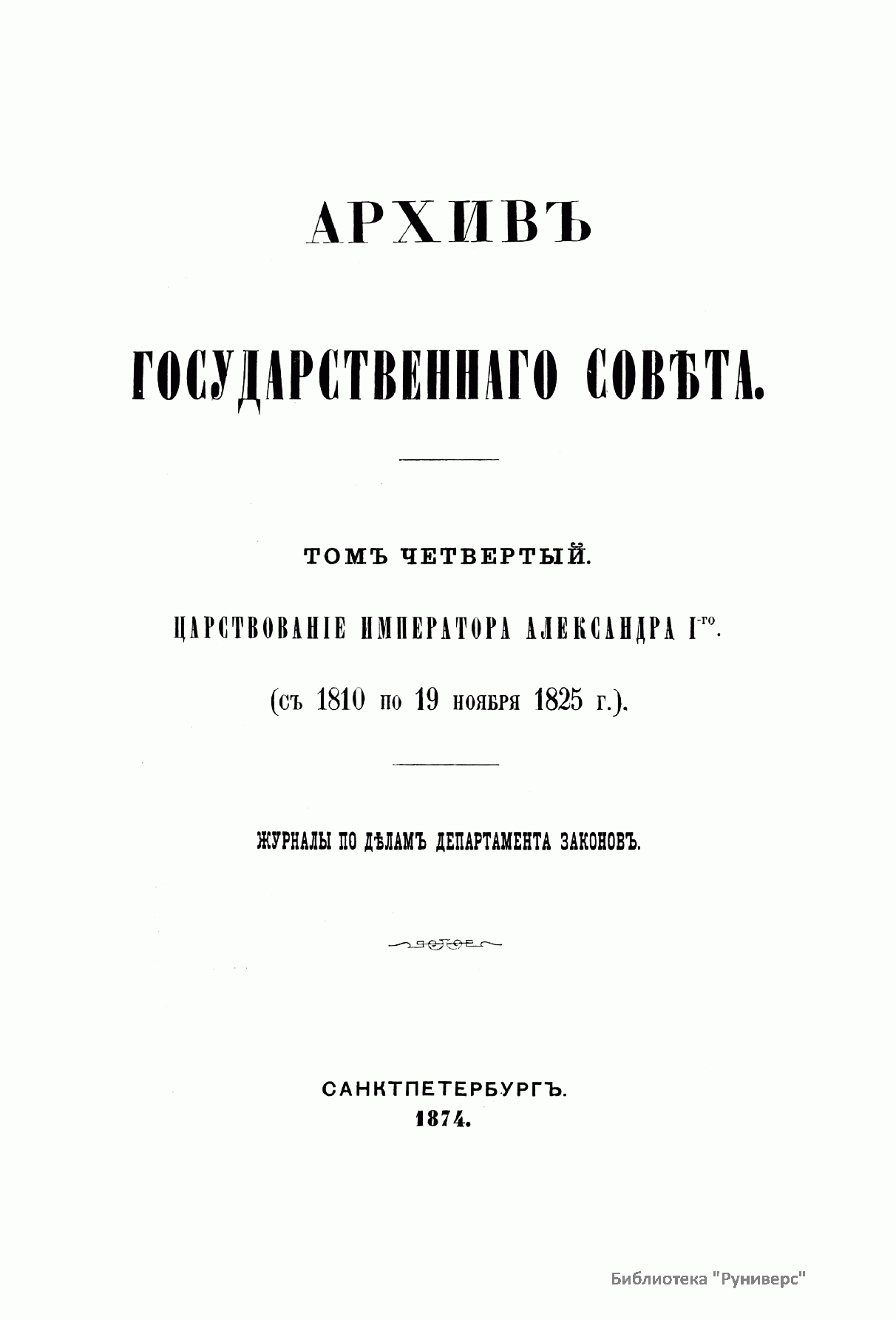 Архивъ Государственнаго совѣта. Томъ четвертый. Совѣтъ въ царствованiе императора Александра I. С 1810 по 19 ноября 1825 г. Журналы по дѣламъ департамента законовъ. Часть первая