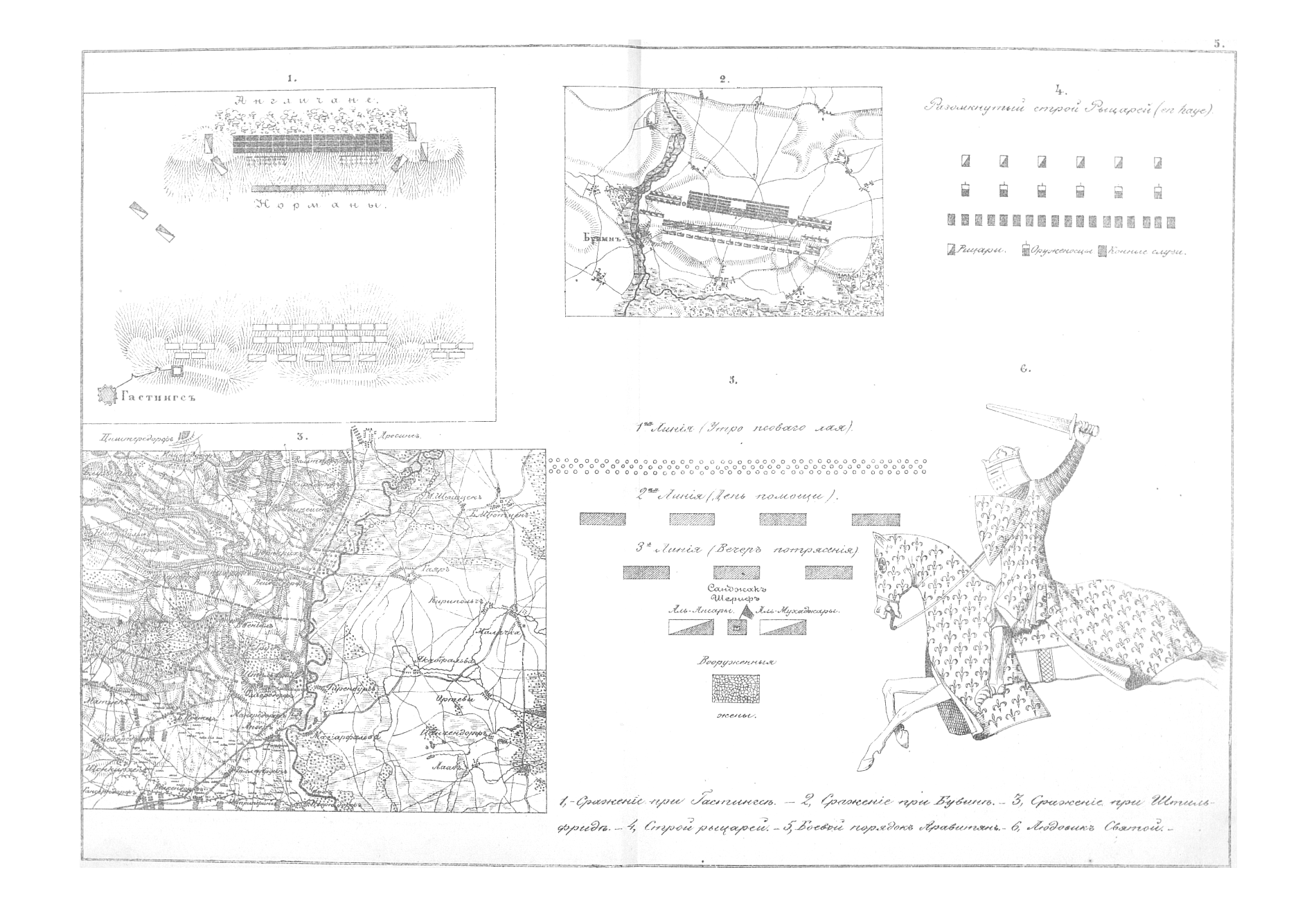 Схемы основных сражений периода европейского Средневековья, подготовленные профессором Николаевской Академии Генерального Штаба по кафедре военного искусства полковником А.К. Пузыревским для иллюстрации читаемого им курса, дополнены оригинальными рисунками военного костюма и вооружения воинов изучаемой эпохи.