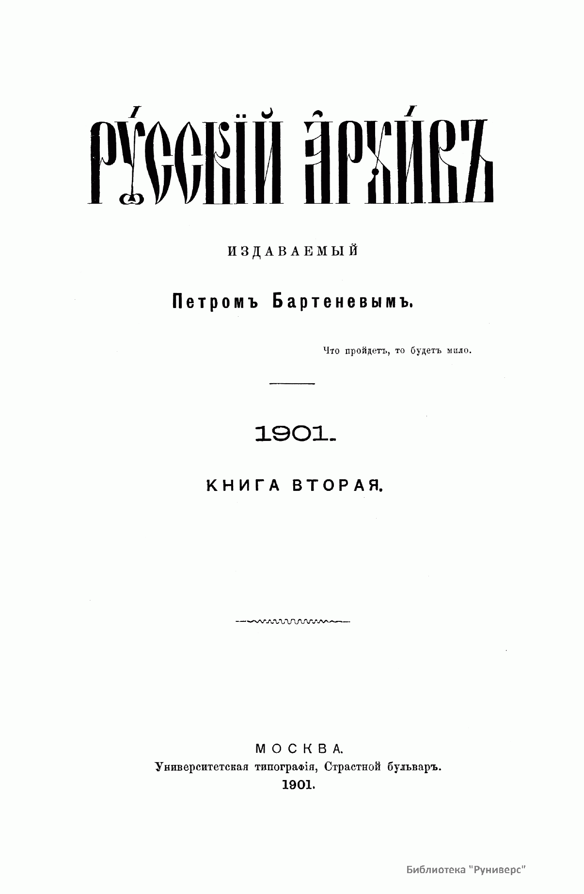 «Русский архив» — ежемесячный историко-литературный журнал, издававшийся в Москве с 1863 по 1917 год. Создателем и продолжительные годы редактором журнала был П. И. Бартенев – историк, археограф, библиограф. Этот журнал называли «живой картиной былого», поскольку он содержал преимущественно публикации неизданных мемуарных, эпистолярных, литературно-художественных и ведомственных документальных материалов, освещавших культурную и политическую историю России в XVIII и XIX вв. По числу опубликованных источников «Русский архив» стоит на первом месте среди русских исторических журналов.