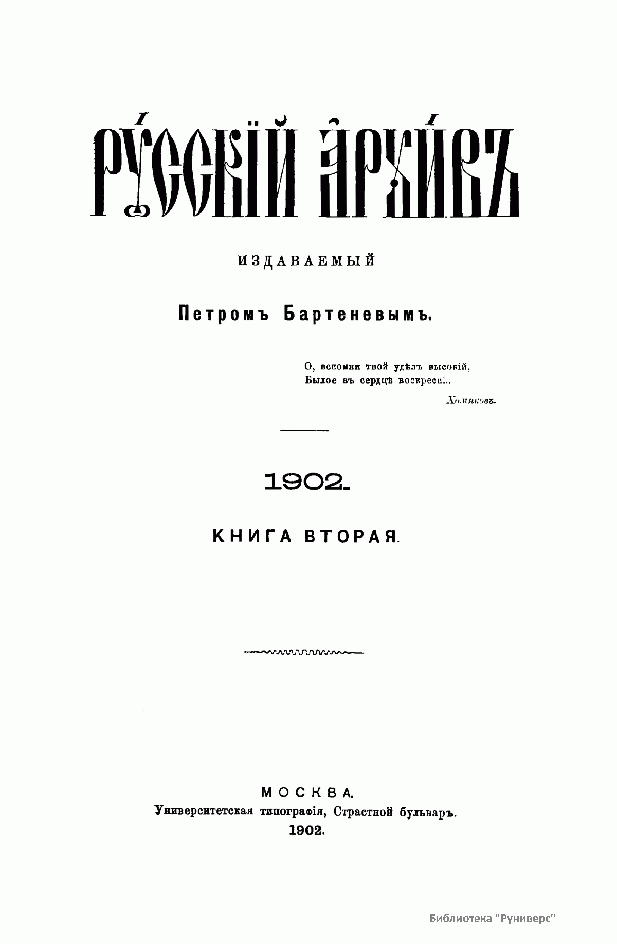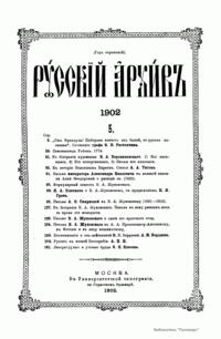 «Русский архив» — ежемесячный историко-литературный журнал, издававшийся в Москве с 1863 по 1917 год. Создателем и продолжительные годы редактором журнала был П. И. Бартенев – историк, археограф, библиограф. Этот журнал называли «живой картиной былого», поскольку он содержал преимущественно публикации неизданных мемуарных, эпистолярных, литературно-художественных и ведомственных документальных материалов, освещавших культурную и политическую историю России в XVIII и XIX вв. По числу опубликованных источников «Русский архив» стоит на первом месте среди русских исторических журналов.