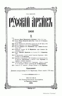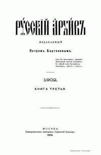 «Русский архив» — ежемесячный историко-литературный журнал, издававшийся в Москве с 1863 по 1917 год. Создателем и продолжительные годы редактором журнала был П. И. Бартенев – историк, археограф, библиограф. Этот журнал называли «живой картиной былого», поскольку он содержал преимущественно публикации неизданных мемуарных, эпистолярных, литературно-художественных и ведомственных документальных материалов, освещавших культурную и политическую историю России в XVIII и XIX вв. По числу опубликованных источников «Русский архив» стоит на первом месте среди русских исторических журналов.