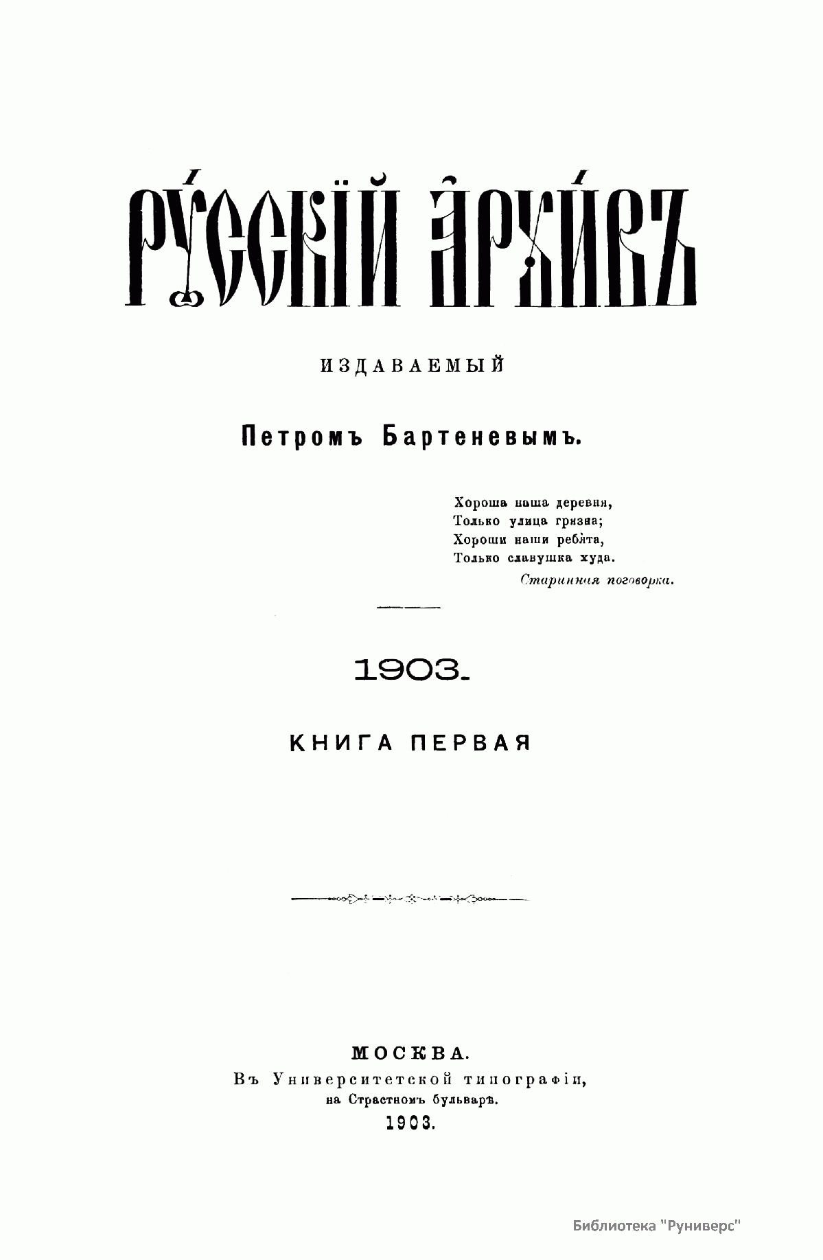«Русский архив» — ежемесячный историко-литературный журнал, издававшийся в Москве с 1863 по 1917 год. Создателем и продолжительные годы редактором журнала был П. И. Бартенев – историк, археограф, библиограф. Этот журнал называли «живой картиной былого», поскольку он содержал преимущественно публикации неизданных мемуарных, эпистолярных, литературно-художественных и ведомственных документальных материалов, освещавших культурную и политическую историю России в XVIII и XIX вв. По числу опубликованных источников «Русский архив» стоит на первом месте среди русских исторических журналов.