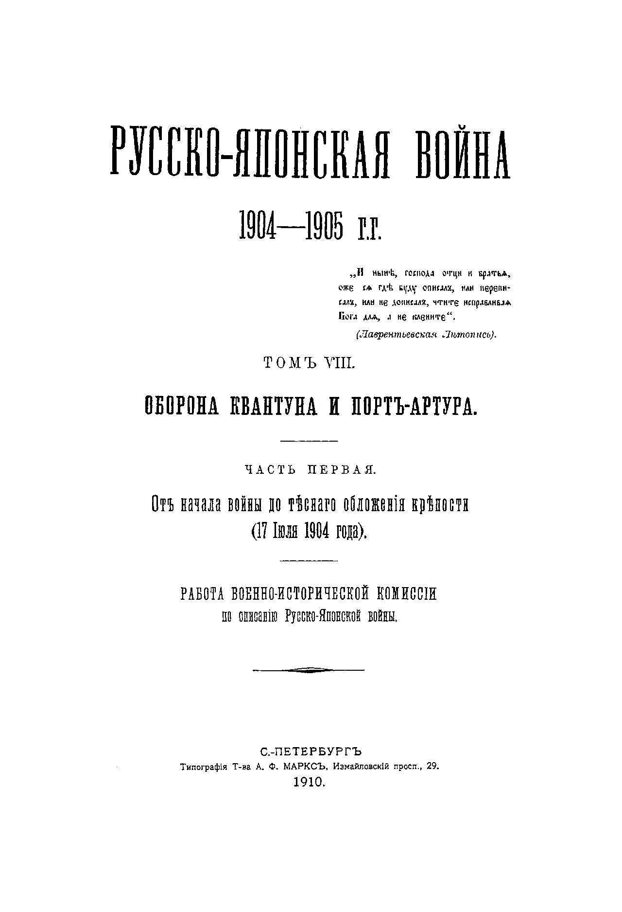 Том VIII. Оборона Квантуна и Порт-Артура. Часть первая. От начала войны до тесного обложения крепости (17 Июля 1904 года)