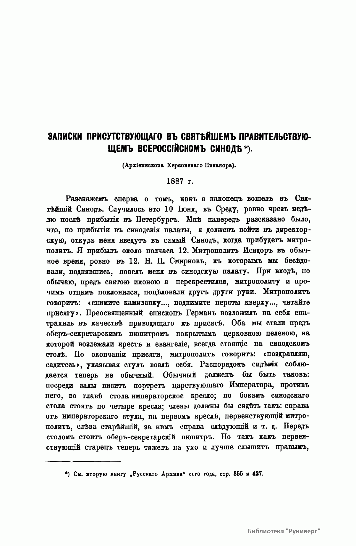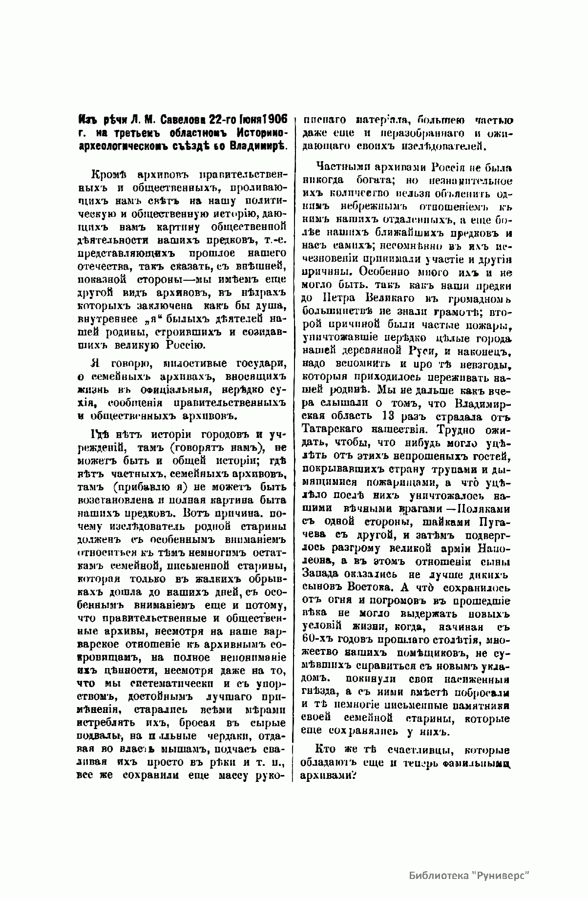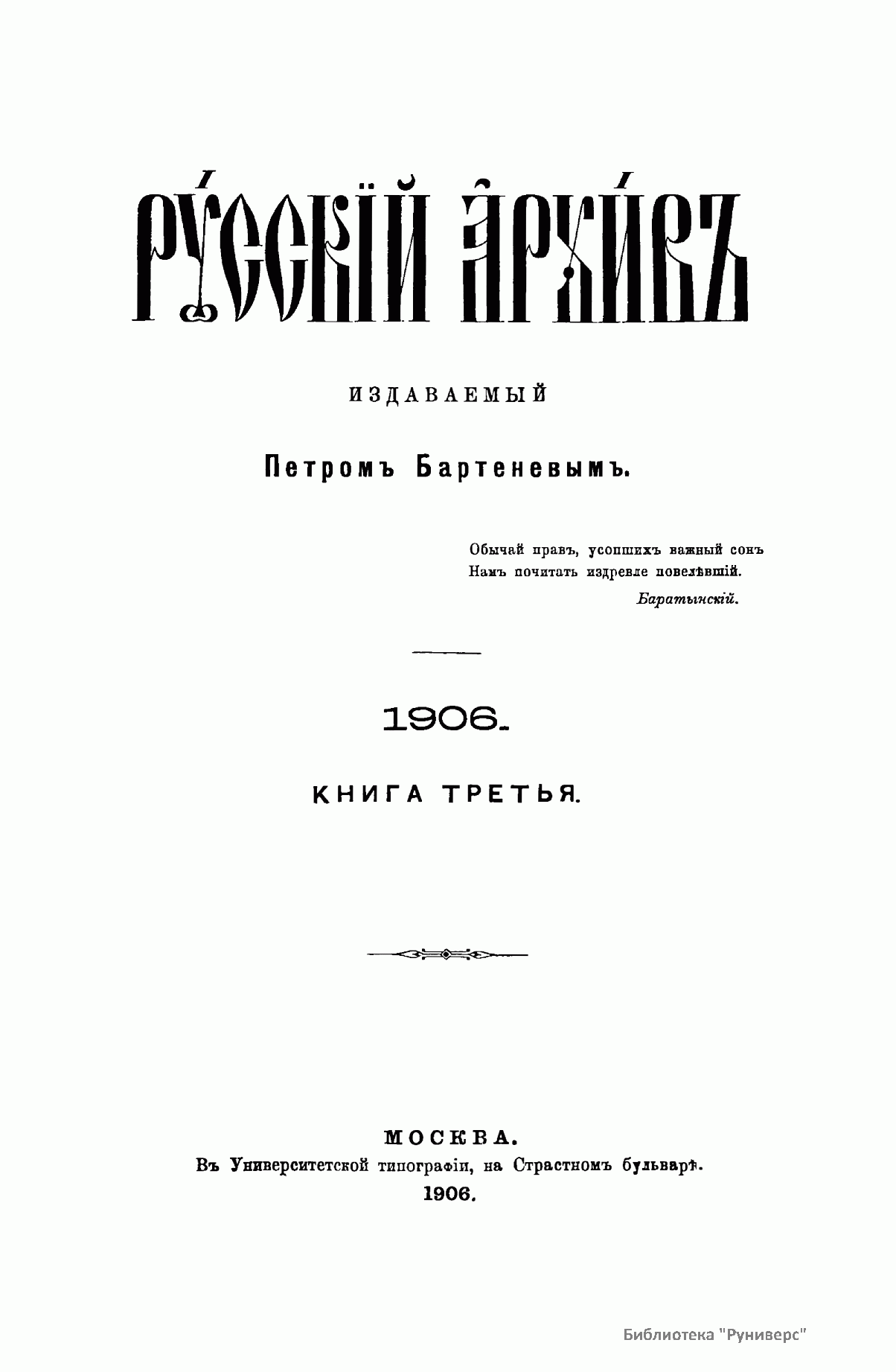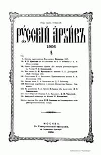 «Русский архив» — ежемесячный историко-литературный журнал, издававшийся в Москве с 1863 по 1917 год. Создателем и продолжительные годы редактором журнала был П. И. Бартенев – историк, археограф, библиограф. Этот журнал называли «живой картиной былого», поскольку он содержал преимущественно публикации неизданных мемуарных, эпистолярных, литературно-художественных и ведомственных документальных материалов, освещавших культурную и политическую историю России в XVIII и XIX вв. По числу опубликованных источников «Русский архив» стоит на первом месте среди русских исторических журналов.