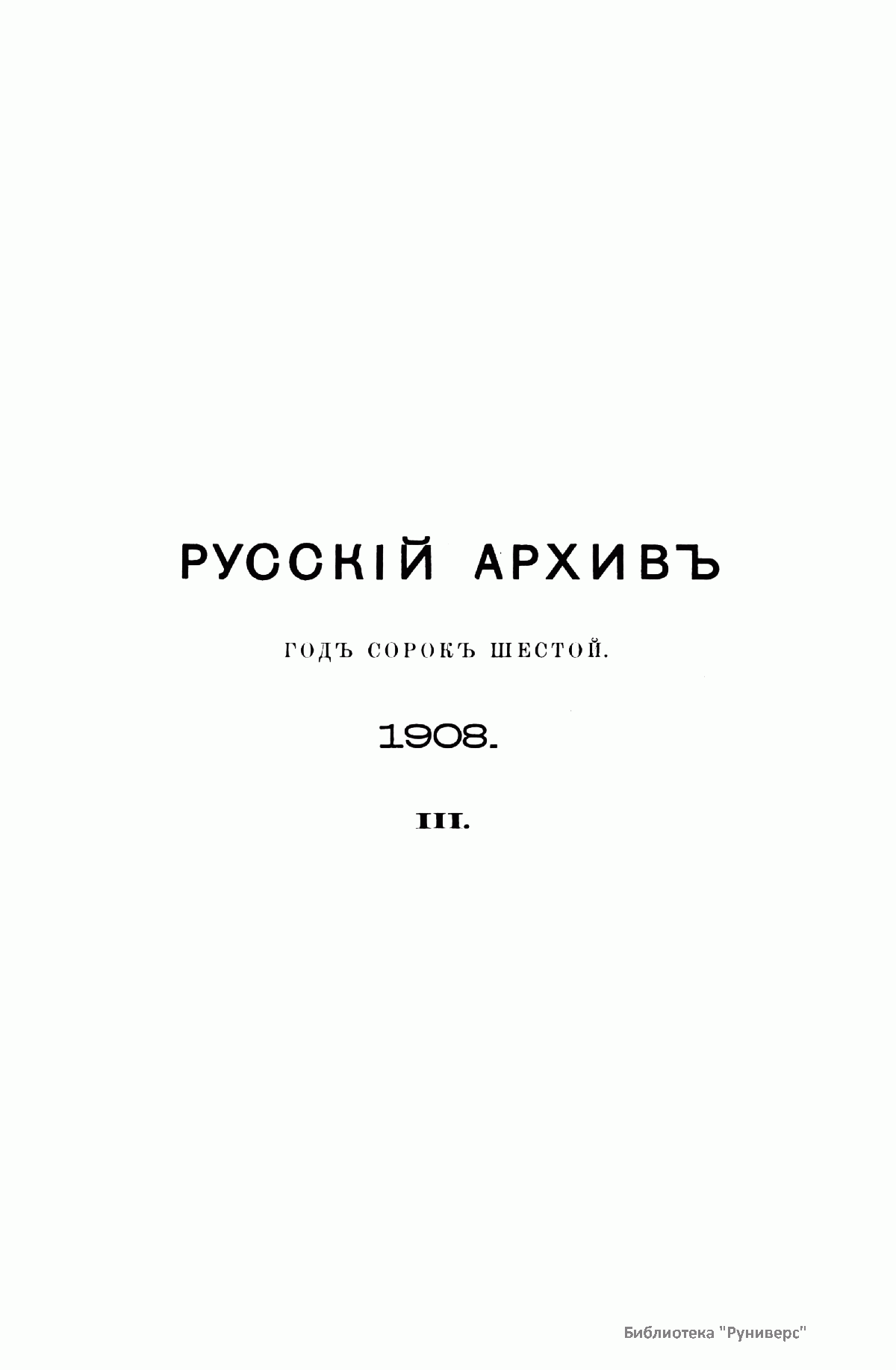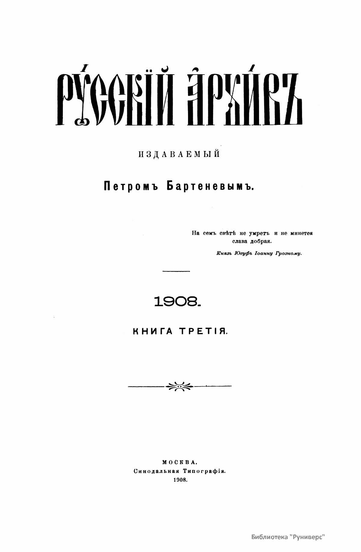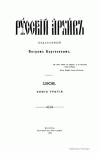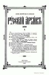 «Русский архив» — ежемесячный историко-литературный журнал, издававшийся в Москве с 1863 по 1917 год. Создателем и продолжительные годы редактором журнала был П. И. Бартенев – историк, археограф, библиограф. Этот журнал называли «живой картиной былого», поскольку он содержал преимущественно публикации неизданных мемуарных, эпистолярных, литературно-художественных и ведомственных документальных материалов, освещавших культурную и политическую историю России в XVIII и XIX вв. По числу опубликованных источников «Русский архив» стоит на первом месте среди русских исторических журналов.