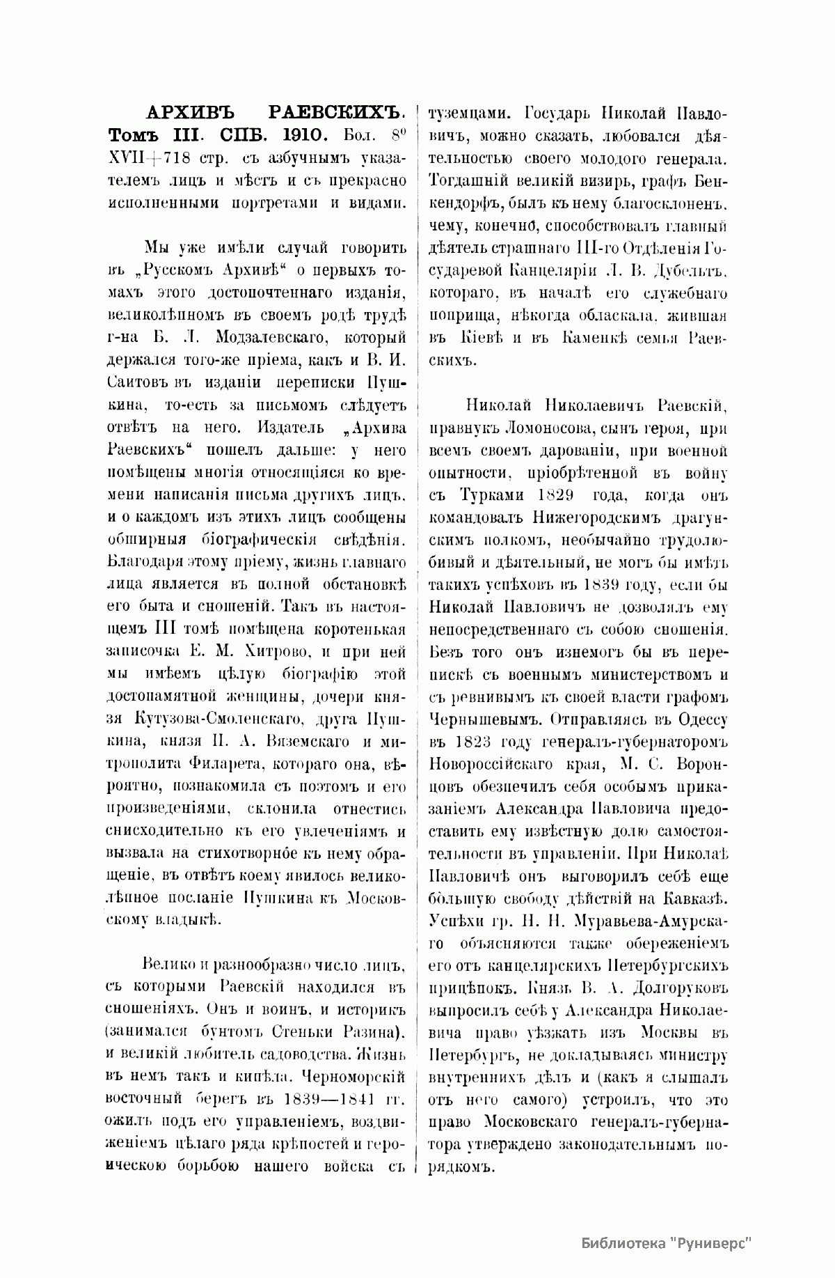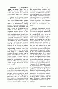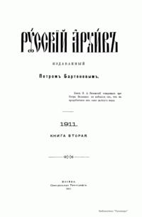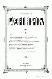 «Русский архив» — ежемесячный историко-литературный журнал, издававшийся в Москве с 1863 по 1917 год. Создателем и продолжительные годы редактором журнала был П. И. Бартенев – историк, археограф, библиограф. Этот журнал называли «живой картиной былого», поскольку он содержал преимущественно публикации неизданных мемуарных, эпистолярных, литературно-художественных и ведомственных документальных материалов, освещавших культурную и политическую историю России в XVIII и XIX вв. По числу опубликованных источников «Русский архив» стоит на первом месте среди русских исторических журналов.