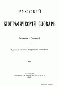 Русский биографический словарь (25 томов), в состав которого вошли имена и биографии виднейших деятелей государства, науки, просвещения и церковных деятелей, издавался Русским историческим обществом с 1896 по 1918 год. Русское историческое общество было основано в Санкт-Петербурге в 1866 году по инициативе известных отечественных историков, военных и государственных деятелей и ставило своей целью всесторонне содействовать развитию русского национального исторического просвещения. Общество пользовалось покровительством и финансовой поддержкой императорской семьи. Его деятельность носила археографический характер. Члены общества собирали исторические документы, которые публиковались в «Сборниках русского исторического общества». Всего до 1920 года (в этом году общество было закрыто) вышло 148 томов. Таким образом в научный оборот было введено большое количество документов XVIII – начала XIX века, ранее недоступных для исследователей, так как документальные материалы архивов царской России были для историков закрыты. К изданию русского биографического словаря, материалы которого до сих пор являются интереснейшим источником для исследователей, Общество приступило по инициативе императора Александра III. Тома биографического словаря выходили не в алфавитном порядке. С 1896 по 1909 год редактором словаря был руководитель Русского исторического общества, промышленник, член Сената Александр Александрович Половцев. Он выпустил 1, 2, 3, 6, 8, 12, 13, 14, 15, 18, 19, 21 и 22-й тома, поэтому этот словарь известен еще как «словарь Половцева».