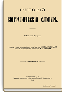 Русский биографический словарь (25 томов), в состав которого вошли имена и биографии виднейших деятелей государства, науки, просвещения и церковных деятелей, издавался Русским историческим обществом с 1896 по 1918 год. Русское историческое общество было основано в Санкт-Петербурге в 1866 году по инициативе известных отечественных историков, военных и государственных деятелей и ставило своей целью всесторонне содействовать развитию русского национального исторического просвещения. Общество пользовалось покровительством и финансовой поддержкой императорской семьи. Его деятельность носила археографический характер. Члены общества собирали исторические документы, которые публиковались в «Сборниках русского исторического общества». Всего до 1920 года (в этом году общество было закрыто) вышло 148 томов. Таким образом в научный оборот было введено большое количество документов XVIII – начала XIX века, ранее недоступных для исследователей, так как документальные материалы архивов царской России были для историков закрыты. К изданию русского биографического словаря, материалы которого до сих пор являются интереснейшим источником для исследователей, Общество приступило по инициативе императора Александра III. Тома биографического словаря выходили не в алфавитном порядке. С 1896 по 1909 год редактором словаря был руководитель Русского исторического общества, промышленник, член Сената Александр Александрович Половцев. Он выпустил 1, 2, 3, 6, 8, 12, 13, 14, 15, 18, 19, 21 и 22-й тома, поэтому этот словарь известен еще как «словарь Половцева».