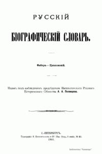 Русский биографический словарь (25 томов), в состав которого вошли имена и биографии виднейших деятелей государства, науки, просвещения и церковных деятелей, издавался Русским историческим обществом с 1896 по 1918 год. Русское историческое общество было основано в Санкт-Петербурге в 1866 году по инициативе известных отечественных историков, военных и государственных деятелей и ставило своей целью всесторонне содействовать развитию русского национального исторического просвещения. Общество пользовалось покровительством и финансовой поддержкой императорской семьи. Его деятельность носила археографический характер. Члены общества собирали исторические документы, которые публиковались в «Сборниках русского исторического общества». Всего до 1920 года (в этом году общество было закрыто) вышло 148 томов. Таким образом в научный оборот было введено большое количество документов XVIII – начала XIX века, ранее недоступных для исследователей, так как документальные материалы архивов царской России были для историков закрыты. К изданию русского биографического словаря, материалы которого до сих пор являются интереснейшим источником для исследователей, Общество приступило по инициативе императора Александра III. Тома биографического словаря выходили не в алфавитном порядке. С 1896 по 1909 год редактором словаря был руководитель Русского исторического общества, промышленник, член Сената Александр Александрович Половцев. Он выпустил 1, 2, 3, 6, 8, 12, 13, 14, 15, 18, 19, 21 и 22-й тома, поэтому этот словарь известен еще как «словарь Половцева».