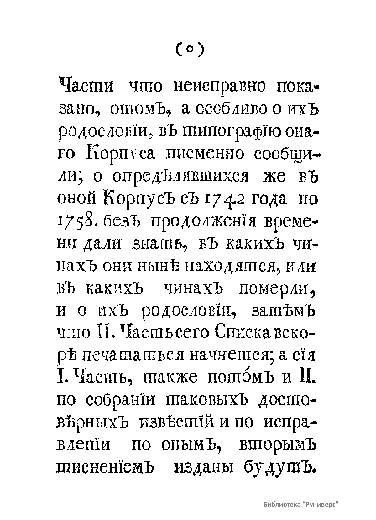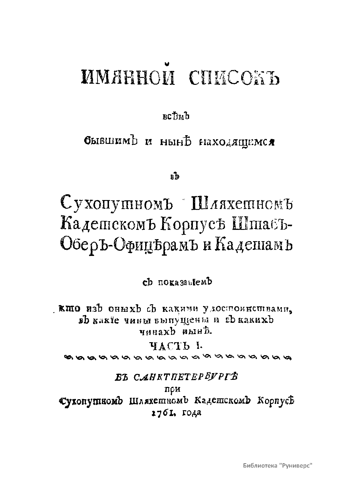 Список живущих и умерших на 1761 г. штаб- и обер-офицеров – руководителей, преподавателей и выпускников Сухопутного Шляхетского кадетского корпуса, а также обучающихся в тот период кадетов Корпуса с краткими личными характеристиками каждого. Список составлен и издан по приказу великого князя Петра Федоровича (будущего императора Петра III).