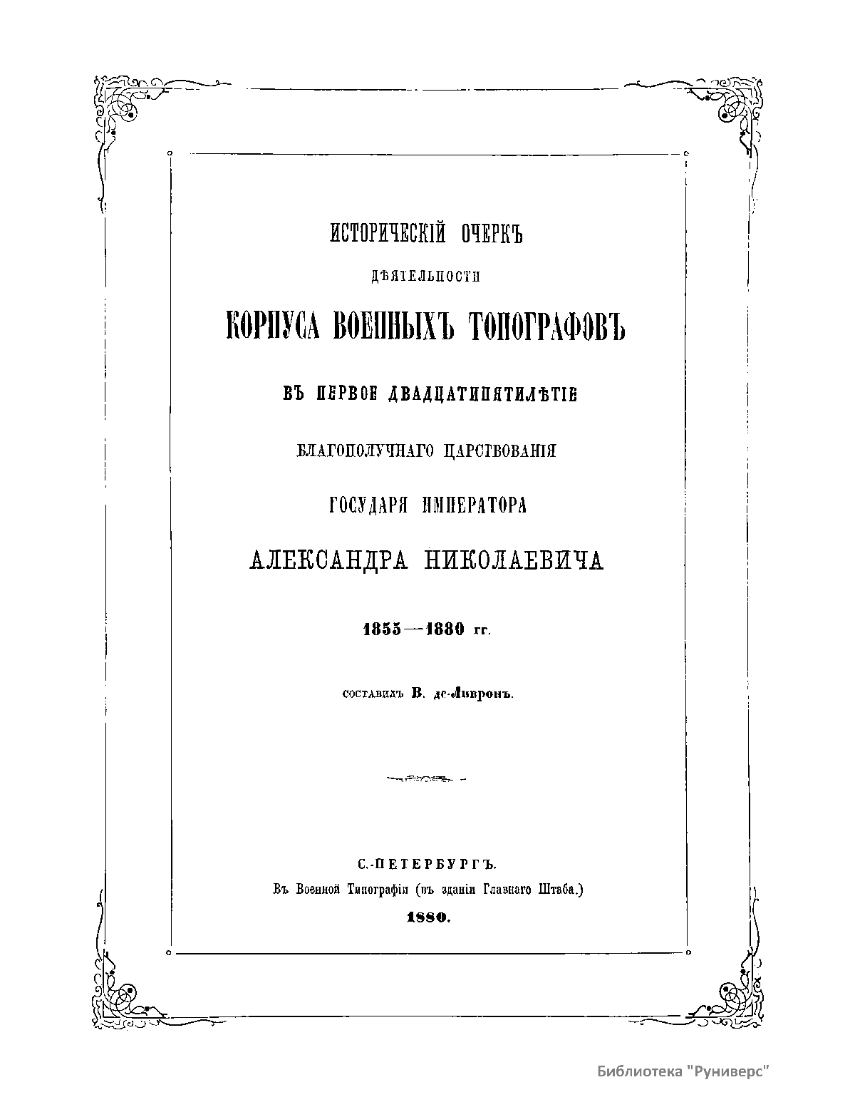 Историческiй очеркъ дѣятельности корпуса военныхъ топографовъ въ первое двадцатипятилѣтие благополучнаго царствованiя Государя Императора Александра Николаевича 1855-1880 гг