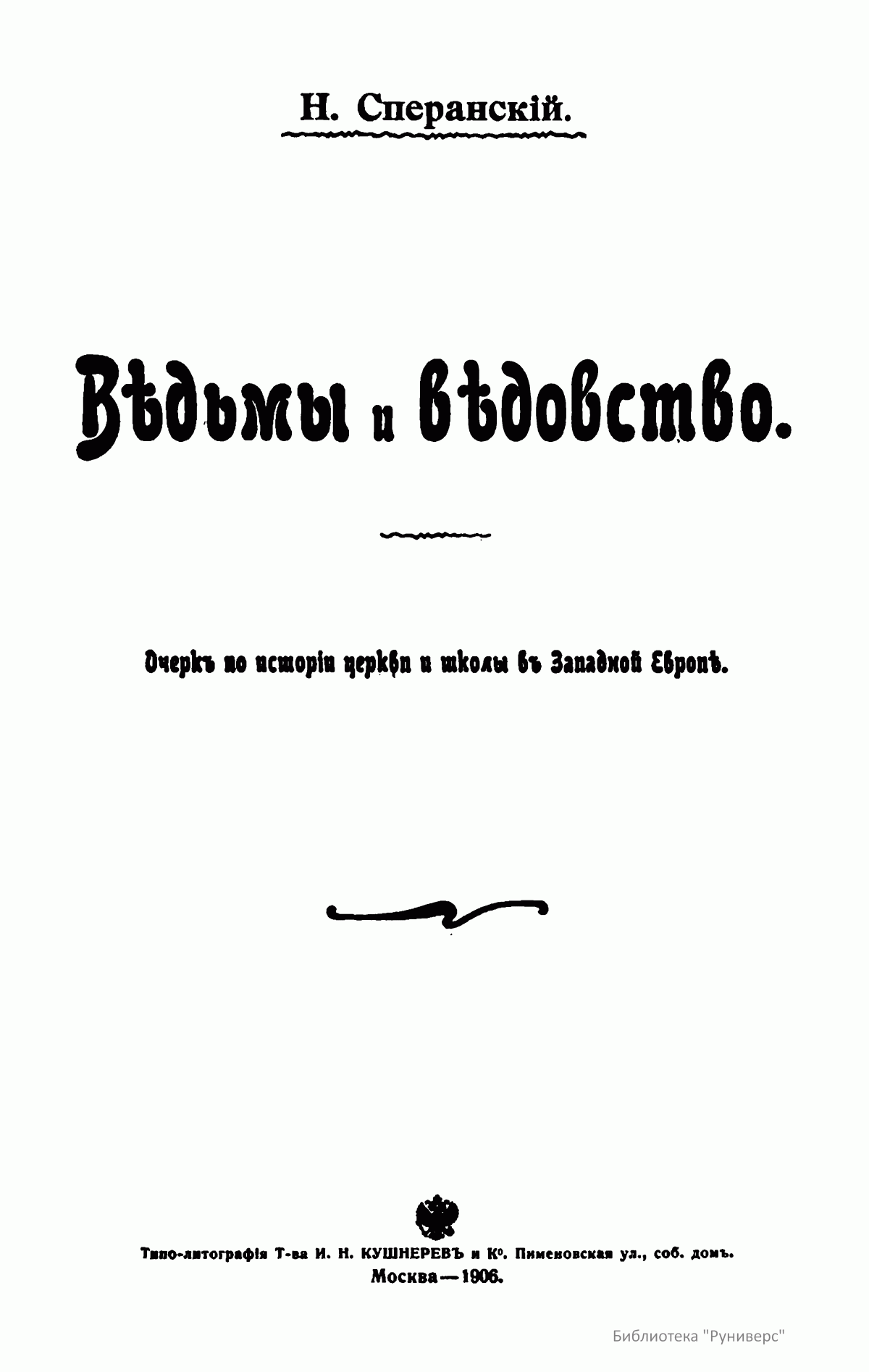 Российский филолог, историк, педагог Н.В.Сперанского (1861-1921) исследовал уходящие в Средневековье истоки системы образования, являвшейся одним из важных факторов, сформировавших европейскую цивилизацию. Напечатал ряд работ по истории европейской школы; главные из них: "Очерки по истории народной школы в Западной Европе" (1898), "Очерк истории средней школы в Германии" (1898), но широкую известность получила книга "Ведьмы и ведовство" (1906). Ему удалось привлечь огромный фактический материал, основанный на устных преданиях, демонологических сочинениях, трактатах по магии и оккультизму, документах инквизиции, законодательстве. Он показывает, как формировались и развивались народные и церковные представления о ведьмах и их «хозяине» Сатане в ходе борьбы церкви с еретическими движениями средневековой Европы. В книге рассматривается выискивание и преследование ведьм европейским обществом и церковью в XV-XVII веках, принявшее форму массовой социальной истерии. На основе устных преданий, сочинений по магии, демонологии и оккультизму, документов инквизиции автор приходит к выводу, что лишь усилия светской власти по уменьшению ведовских процессов и распространение просвещения смогли переломить ситуацию и преодолеть страх перед потусторонними силами.