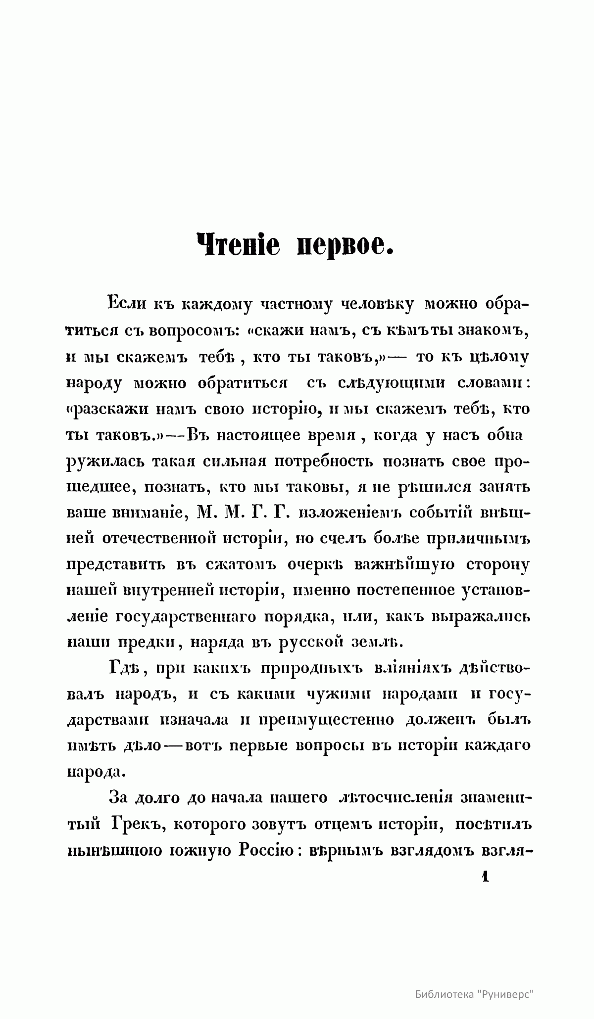 В книге опубликованы четыре лекции С. Соловьева о постепенном установлении государственного порядка в русской земле до Петра Великого. В первой лекции говорится о том, как положены были основы русского общества, как сложились его части. Во второй лекции речь идет о духовном начале, которое дало духовное единство этим частям. Это духовное начало явилось вместе с христианством, пришедшим из Византии. Также автор рассуждает о родовой связи между членами одного рода и ее разрушении. При содействии правительственного начала, дружины и церкви, формы родового быта стали уступать другим гражданским формам, но родовой быт оставался еще столь могущественным, что, в свою очередь, действовал на изменявшие его начала. Когда семья Рюриковичей становится многочисленной, между ее членами начинают действовать чисто родовые отношения. Князья считают всю русскую землю в общем нераздельном владении всего своего рода, причем старший в роде, Великий князь, сидит на старшем столе, другие родичи занимают другие столы, более или менее значительные. Когда умирает Великий князь, то достоинство его вместе с главным столом переходит не к старшему его сыну, но к старшему в целом княжеском роде. Связь между старшими и младшими членами рода остается чисто родовой, а не государственной. В третьей лекции говорится о постепенном переходе от родовых отношений к государственным, отчего зависело единство и могущество Руси и перемена всего внутреннего порядка. Начало этого нового порядка на севере замечено еще до монголов, поэтому монгольские отношения в истории важны только в той мере, в какой они содействовали или препятствовали утверждению новых отношений. Влияние монголов не было здесь главным и решительным, они жили вдалеке и заботились только о сборе дани, не вмешиваясь во внутренние отношения. Усиление северной Руси вследствие нового порядка вещей обеспечило успешную ее борьбу с Польским королевством, целью которой становится соединение обеих половин Руси под одной державой. Окончание внутренней борьбы дает северной Руси, или Московскому государству, войти в сношения с европейскими государствами, готовить себе среди них место. В таком положении находилась Русь в конце XVI века, когда пресеклась династия Рюриковичей. В четвертой лекции речь идет о русской земле при первых государях новой династии, о новых стремлениях и потребностях общества, об изменении военного строя и постоянном войске, о промышленности и торговле, о мерах правительства об удержании крестьян на постоянных местах жительства, о церкви, науке и просвещении. В заключение автор говорит о священном завете, полученном Россией от предков: «велика бывает польза от учения книжного». Эти слова летописца XII века должен повторять каждый историк, если он хочет быть верен своему народу и своей истории.