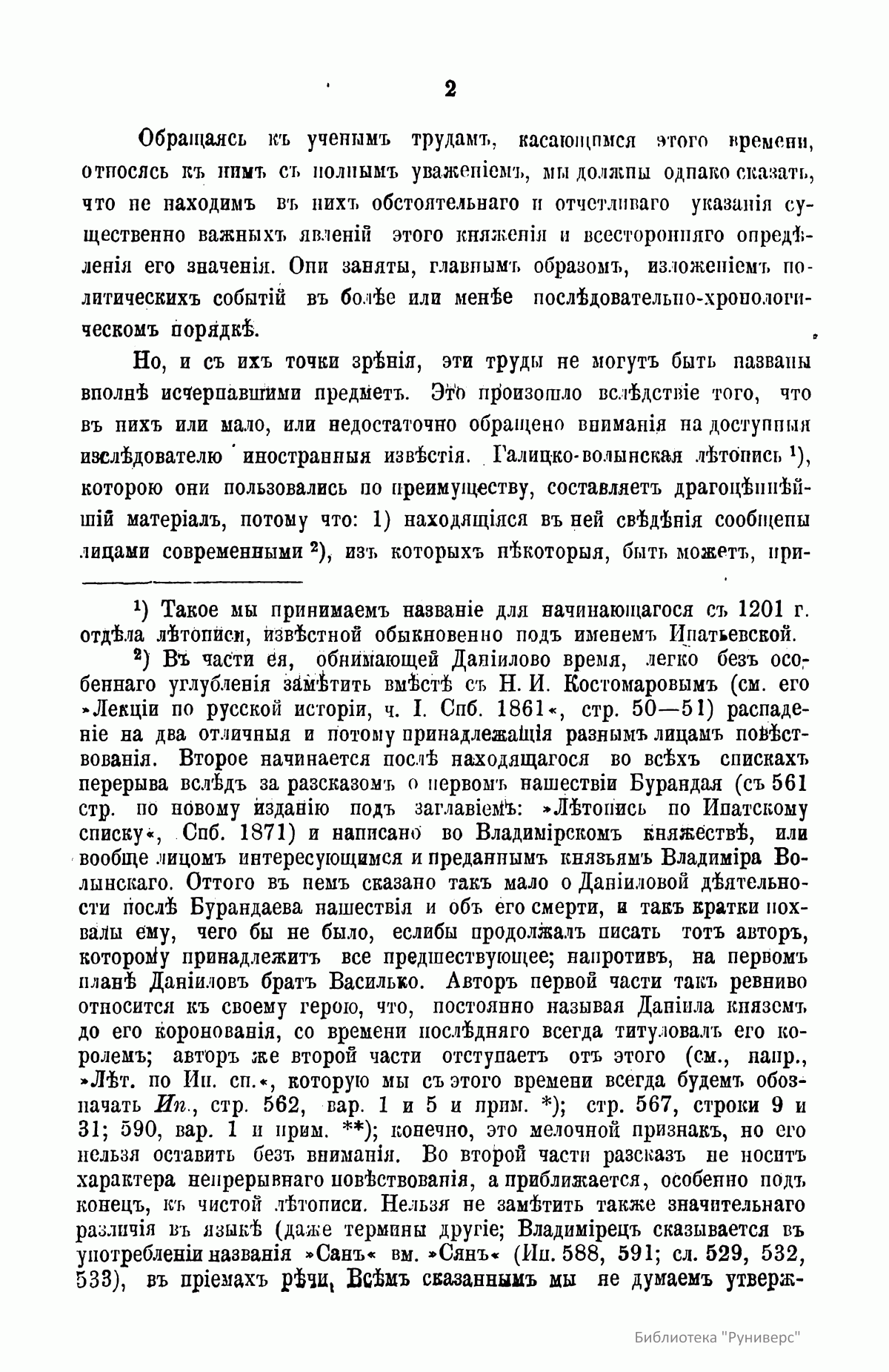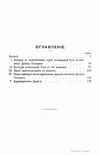 В книге опубликовано сочинение студента историко-филологического факультета Киевского университета св. Владимира, удостоенное золотой медали. Задача настоящего труда – указать и объяснить посредством сравнительно-исторического изучения русских и иностранных источников «замечательные явления» княжения Даниила Галицкого (1201 – 1264), которыми определяется историческое значение этого княжения. При Данииле значительная по объему юго-западная часть Руси отделилась от прочих русских земель и начала жить особенной жизнью. Она значительно окрепла, благодаря тому, что представляла собой на время как бы одно целое. Единение это долго не продолжалось, но важно было то, что юго-западная Русь сосредоточилась в руках меньшего числа лиц, принадлежавших одному роду. Княжение Даниила отсрочило на целое столетие падение юго-западной Руси и тягости чужеземного ига. Существуя в течение целого столетия после татарского нашествия, юго-западная Русь отвлекала внимание Литвы от востока, принимала на себя ее удары и давала возможность Москве крепнуть, в то время как Псков и Новгород не допускали к Москве ливонцев.