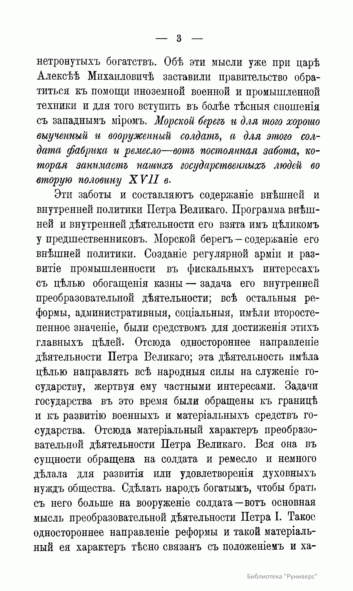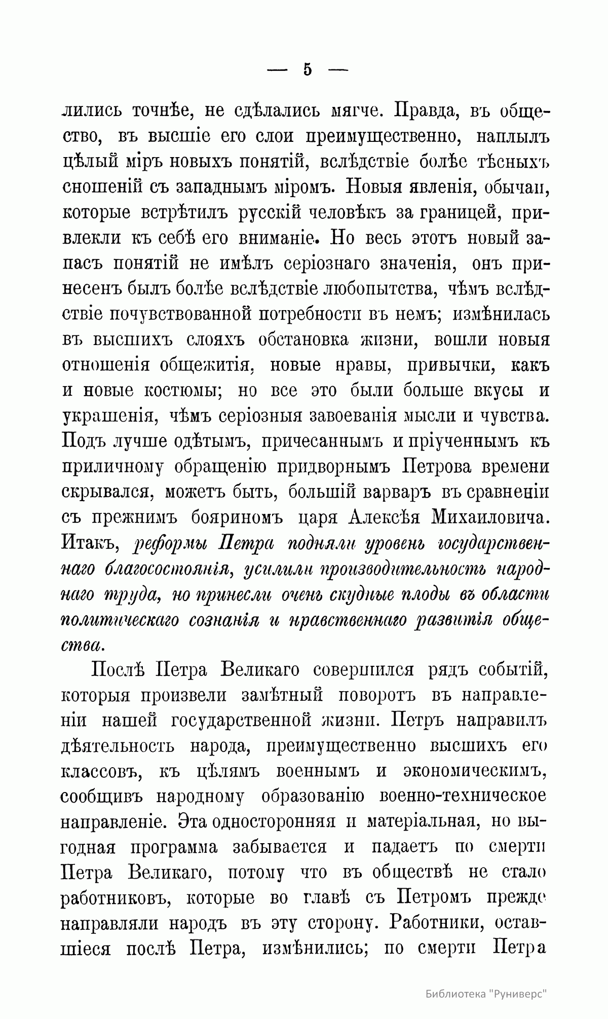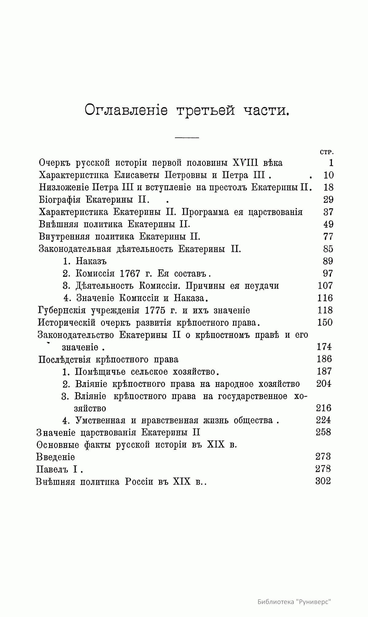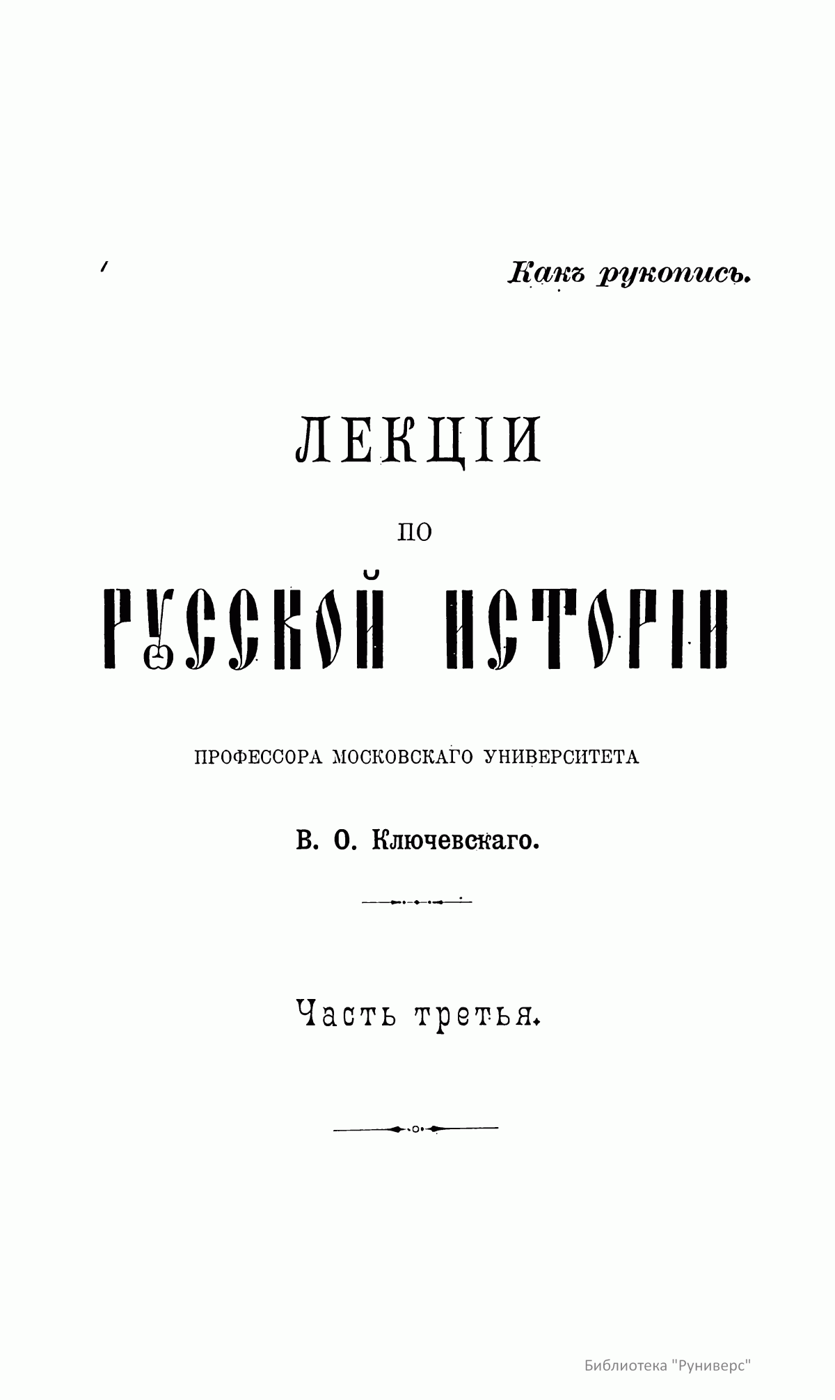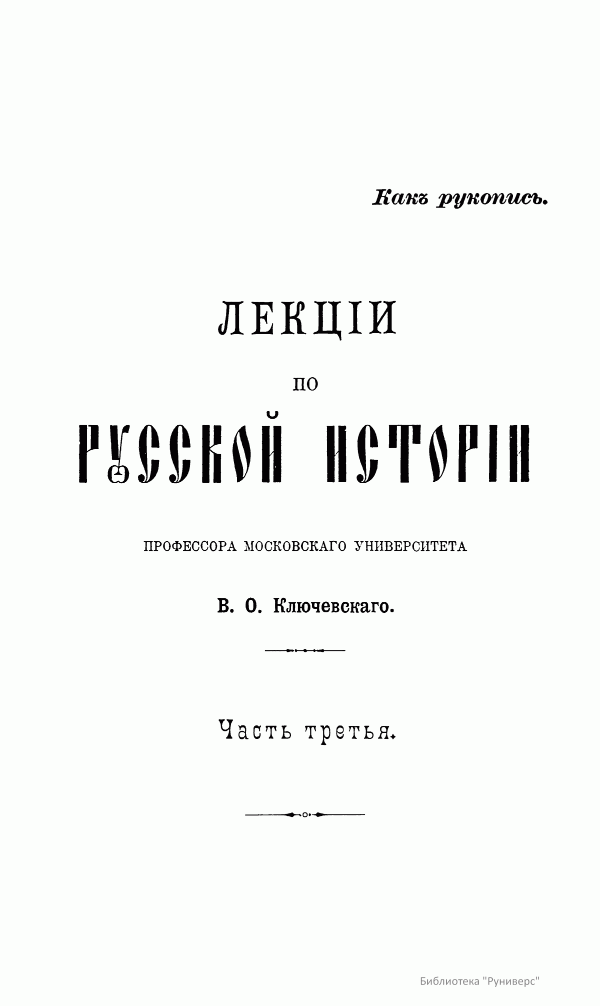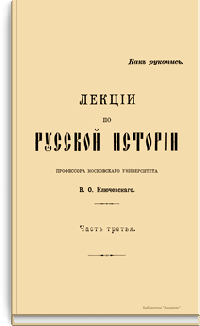 Настоящие лекции – общий курс истории России, в котором В. О. Ключевский изложил свою концепцию исторического развития России. Ученый полагает, что цель изучения местной истории такая же, как цель изучения человеческой истории вообще. Предмет всеобщей истории – это процесс человеческого общежития. Это общежитие слагается из взаимодействия различных общественных элементов, сил, строящих человеческое общество. Эти силы: природа и люди, лицо и общественный союз, власть и право, труд и капитал, знание и искусство и т.д. Эти силы присутствуют в каждом обществе, но общество, ими созидаемое, в разные времена и в различных местах выходит не одинаковым по своему характеру и своим формам. Это происходит оттого, что перечисленные общественные силы в разных местах и разные времена приходят не в одинаковые сочетания. Чем более разнообразные сочетания элементов мы изучаем, тем более узнаем новых свойств в общественных элементах, тем полнее познаем природу каждого из них. Путем исторического изучения мы познаем не только природу общественных элементов, но и их механизм, узнаем, когда известная общественная сила двигала человечество вперед и когда задерживала его движение, когда, например, капитал уничтожал свободный труд, не усиливая его производительности, и когда, наоборот, этот капитал помогал труду стать более производительным, не порабощая его. Таким образом, в курсе истории России В. О. Ключевского интересуют прежде всего следующие вопросы: какие своеобразные местные сочетания представляет данная история отдельного народа, как возникали эти своеобразные сочетания, какие новые свойства обнаруживали действующие в ней стихии. В своем изложении он ограничивается фактами экономической и политической жизни и делит историю на периоды, соответствующие изменениям отношений между основными общественными элементами. Первая часть включает три периода. Первый период продолжается с VIII до конца XII века, когда масса русского населения сосредоточивалась на среднем и верхнем Днепре с его притоками и историческим его водным продолжением областью Ловати-Волхова. Второй период – это время Верхне-Волжской удельной Руси с конца XII до половины XV века. Третий период начинается со вступления Иоанна III на княжеский стол в 1462 году и продолжается до 1613 года, когда на московском престоле появляется новая династия Вторая часть включает четвертый период – с 1613 года, когда земский собор выбрал на московский престол царя Михаила Федоровича до 1762 года – перемен в государственном положении дворянства, землевладельческом и служебном. Третья часть включает два отдела. Первый посвящен XVIII веку. Второй включает конец XVIII века и XIX столетие – по царствование Александра II (в приложении говорится об Александре III).