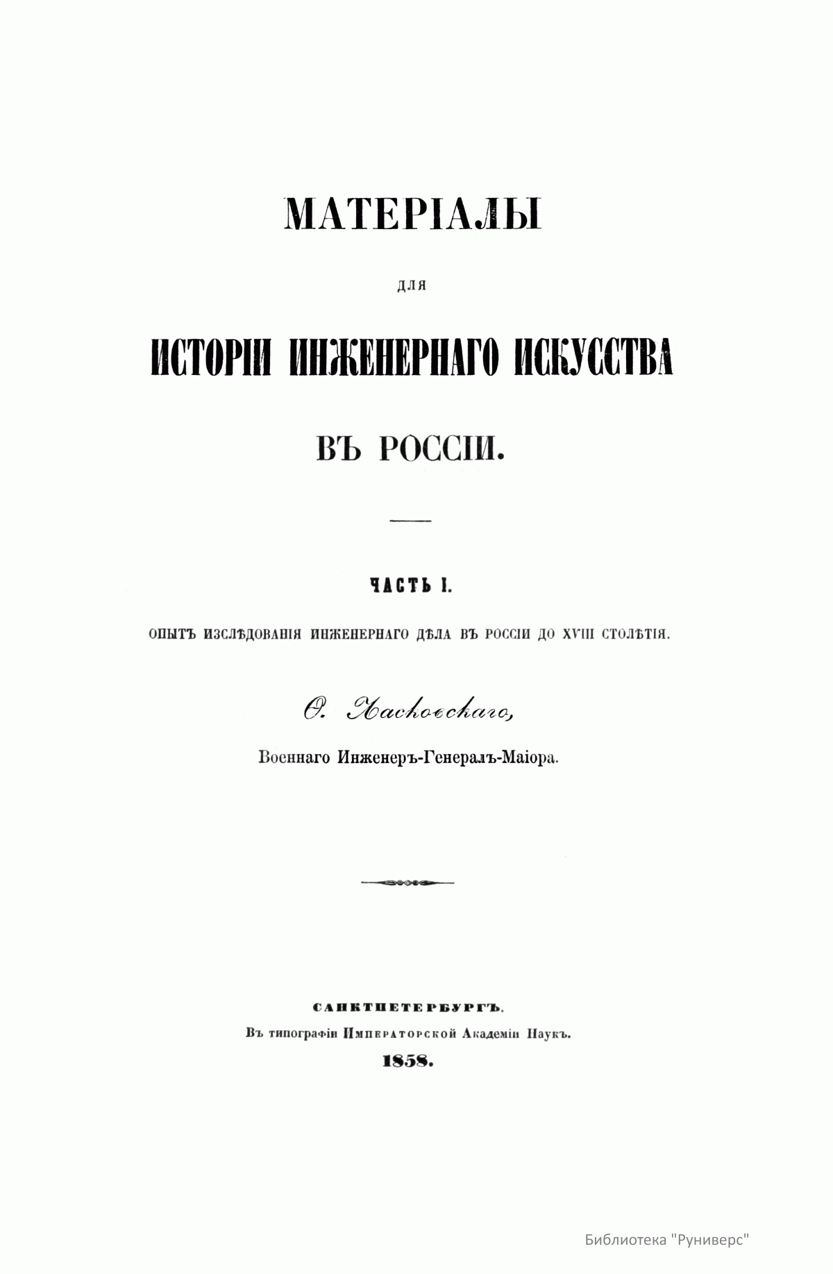 Часть I. Опыт исследования инженерного дела в России до XVIII столетия. Часть II. Опыт исследования инженерного искусства в царствование Императора Петра Великого