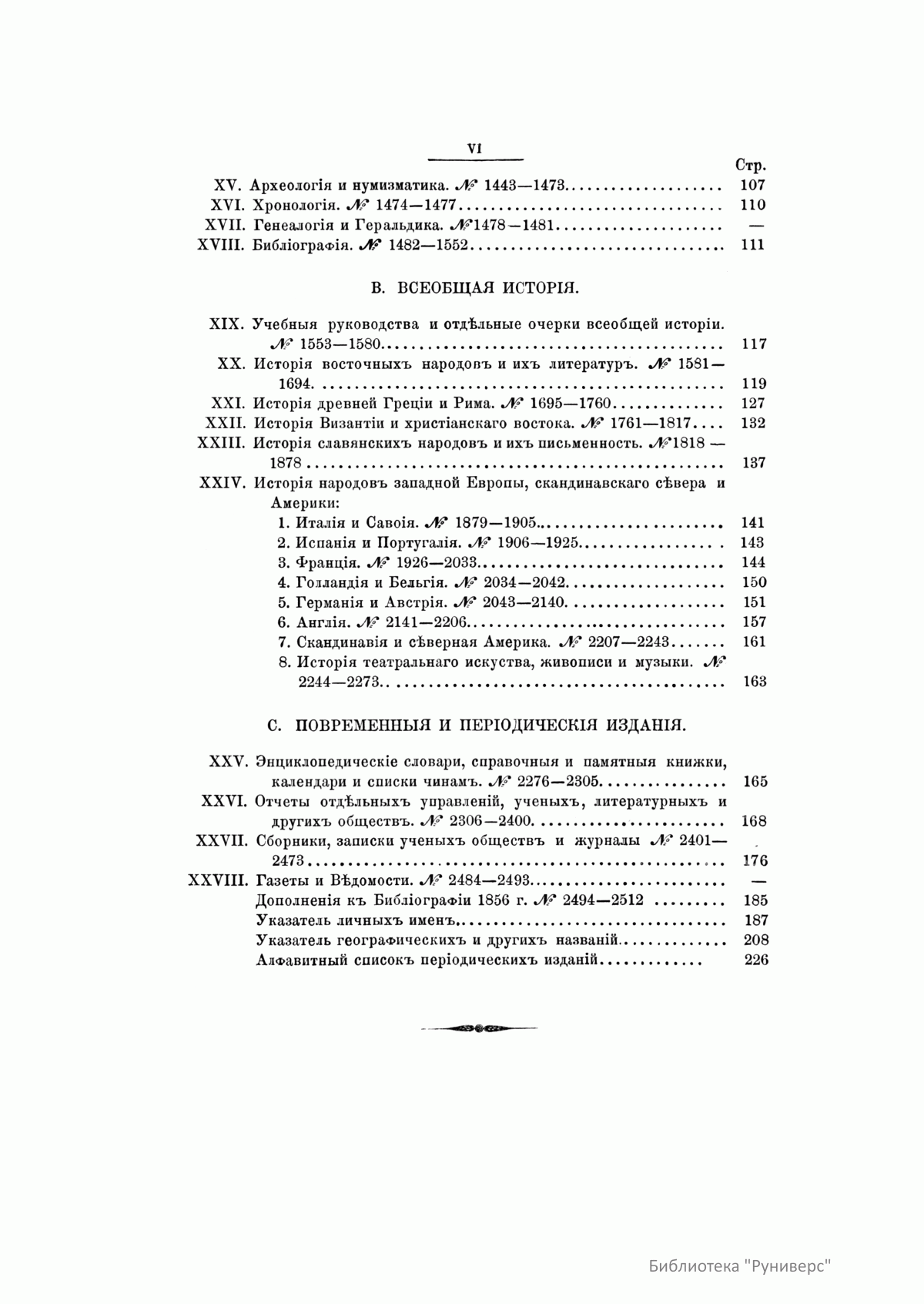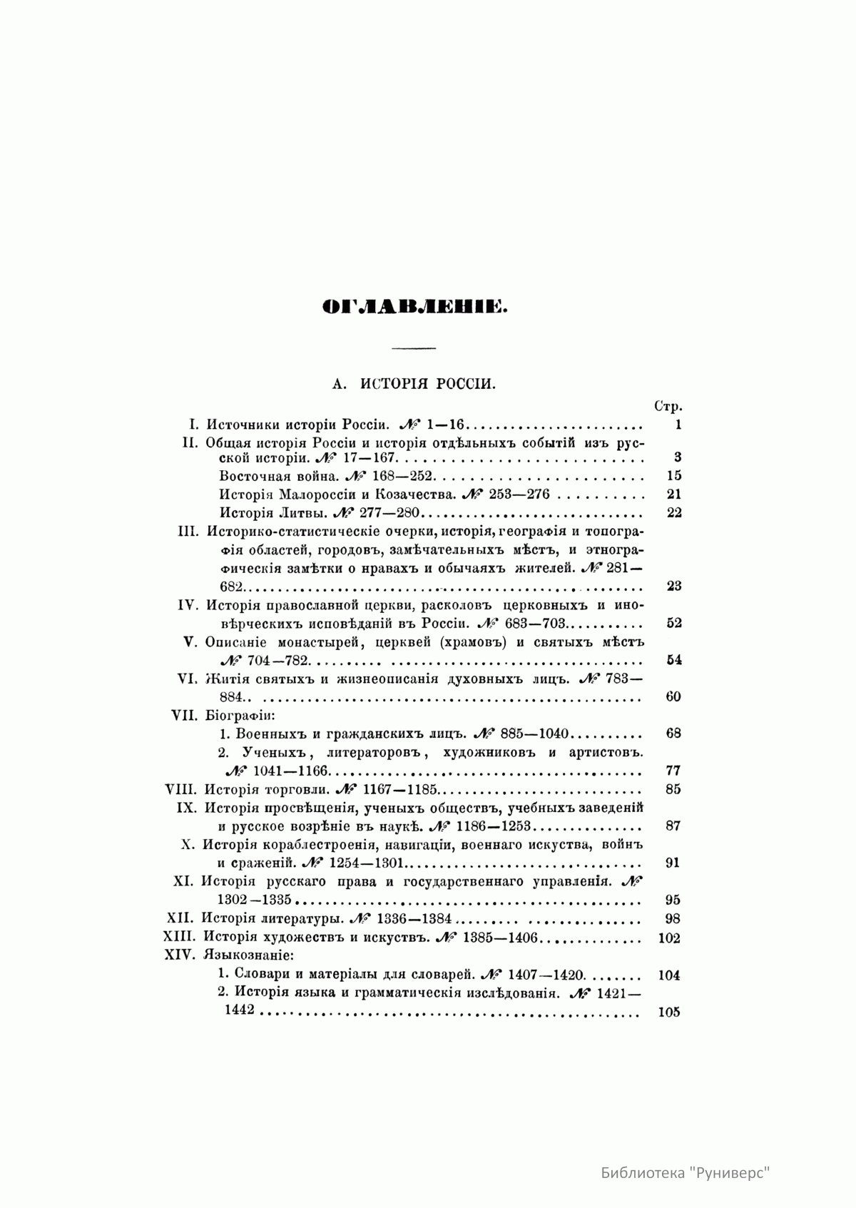 В десяти томах «Русской исторической библиографии» заключается описание свыше 44 000 книг, карт, периодических изданий, статей из журналов и газет по русской и всеобщей истории. Кроме этого, богато представлена литература о Крымской войне 1853–1856 гг., реформе 1860-х гг., польском восстании 1863–1864 гг. и о других событиях.