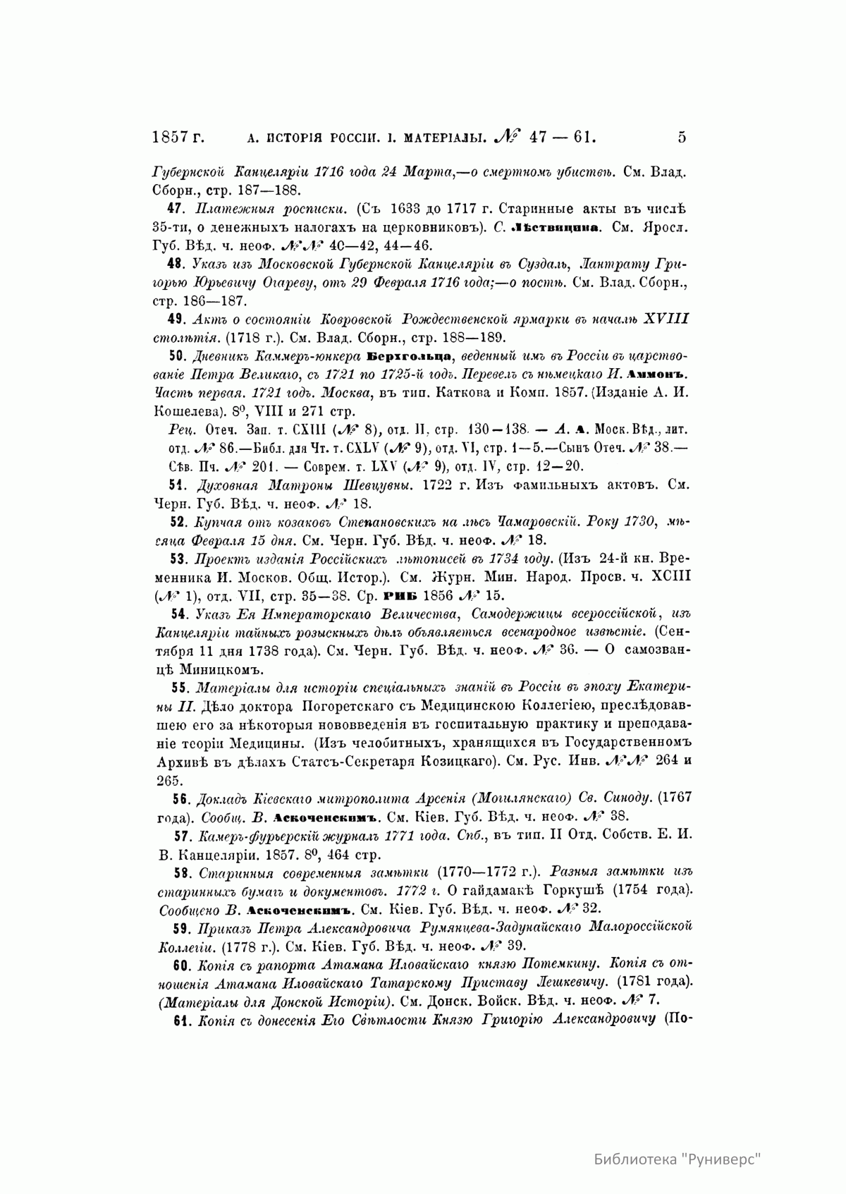 В десяти томах «Русской исторической библиографии» заключается описание свыше 44 000 книг, карт, периодических изданий, статей из журналов и газет по русской и всеобщей истории. Кроме этого, богато представлена литература о Крымской войне 1853–1856 гг., реформе 1860-х гг., польском восстании 1863–1864 гг. и о других событиях.