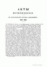 Пятитомное собрание «Актов исторических» было издано Археографической комиссией в 1841–1842 годах в Санкт-Петербурге. Комиссией были собраны и подготовлены письменные памятники по отечественной социально-экономической, политической, дипломатической и военной истории, а также по истории русской церкви за 1334–1700 годы. Цель выпуска — объяснение исторических событий, законодательства, статистики Русского государства за данный период.