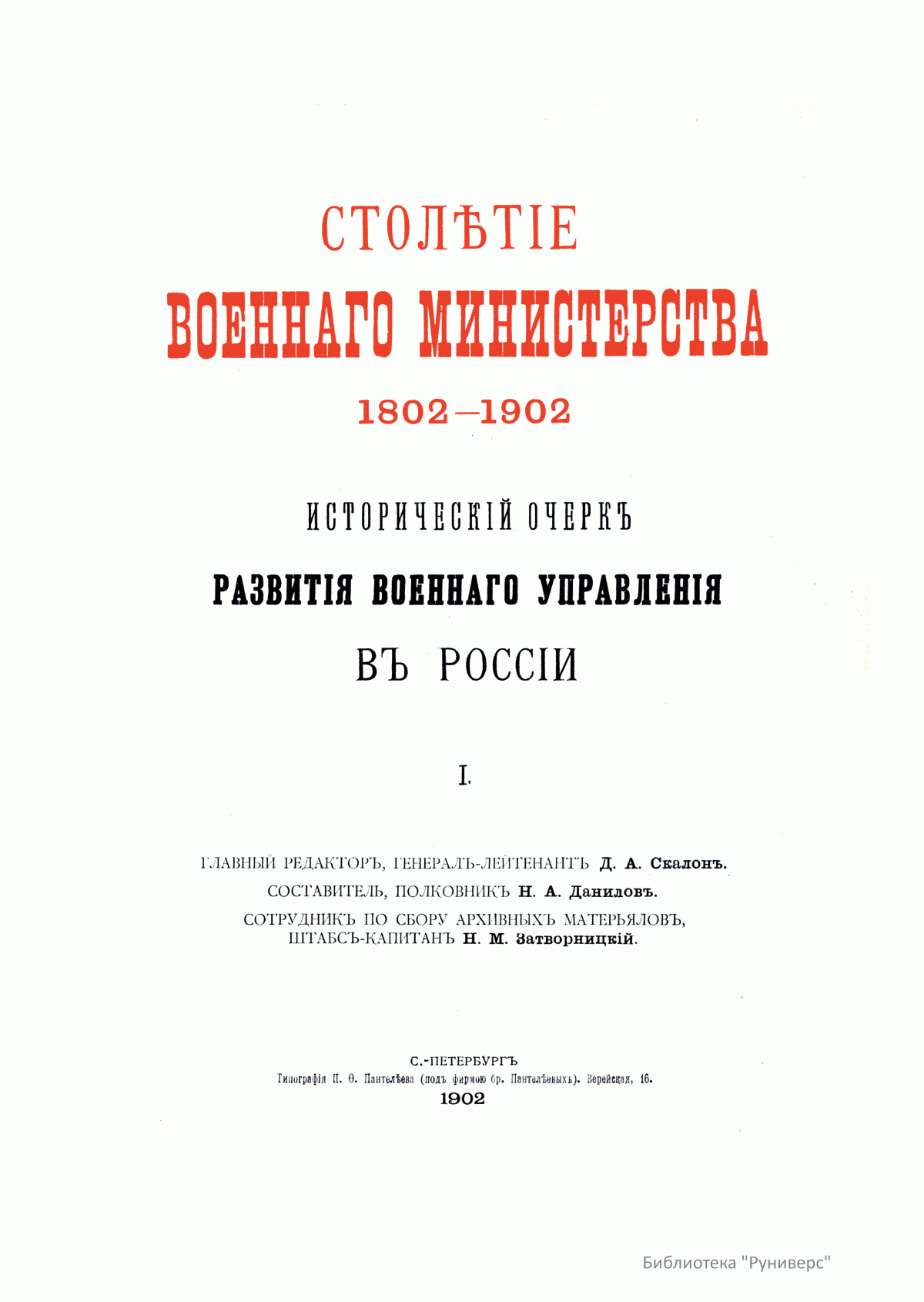 1902 году в России отмечался столетний юбилей образования в России министерств. Император Николай II перед празднованием юбилея отдал распоряжение о написании книг, посвященных истории деятельности министерств и ведомств за 100 лет. Военному министру генерал-лейтенанту Д. А. Скалону было отдано распоряжение составить историю военного министерства.