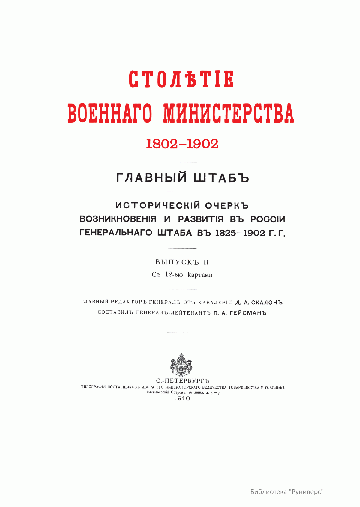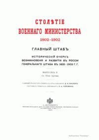 Столѣтiе военнаго министерства. 1802-1902. Главный штабъ. Историческiй очеркъ возникновенiя и развитiя въ Россiи генеральнаго штаба въ 1825-1902 гг.