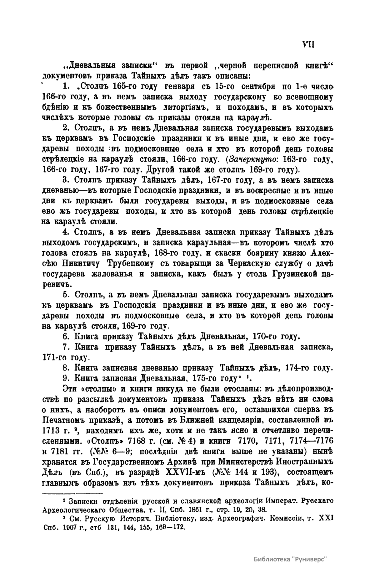 Приказ тайных дел, или тайный приказ, был учрежден около 1658 г. царем Алексеем Михайловичем и являлся как бы собственной канцелярией царя. В нем заседали дьяк и человек 10 подьячих. Бояре и думные люди не входили в состав приказа, так как он был учрежден главным образом для наблюдения за их деятельностью. Подьячие приказа тайных дел посылались с послами в разные государства и на посольские съезды, а также с воеводами на войну. Они должны были следить за действиями послов и воевод и обо всем доносить царю. В приказе тайных дел производились следствия по важнейшим государственным делам, ведались мастера гранатного дела, само гранатное дело и заводы. В ведении этого же приказа состояла любимая царская потеха – птицы, кречеты и ястребы, с особым штатом для их ловли и обучения, а также голубятни, в которых было более 100 тысяч голубиных гнезд для корма хищных птиц. Приказ тайных дел был уничтожен со смертью царя Алексея Михайловича. В настоящем издании опубликованы «Дневальные записки» приказа тайных дел. Они состоят из поденных известий: 1). О царе Алексее Михайловиче – где он был и что делал в данный день. 2). О том, какая была погода. 3). Какой стрелецкий приказ стоял на карауле около дворца. Издание представляет несомненный интерес для занимающихся историей XVII века.