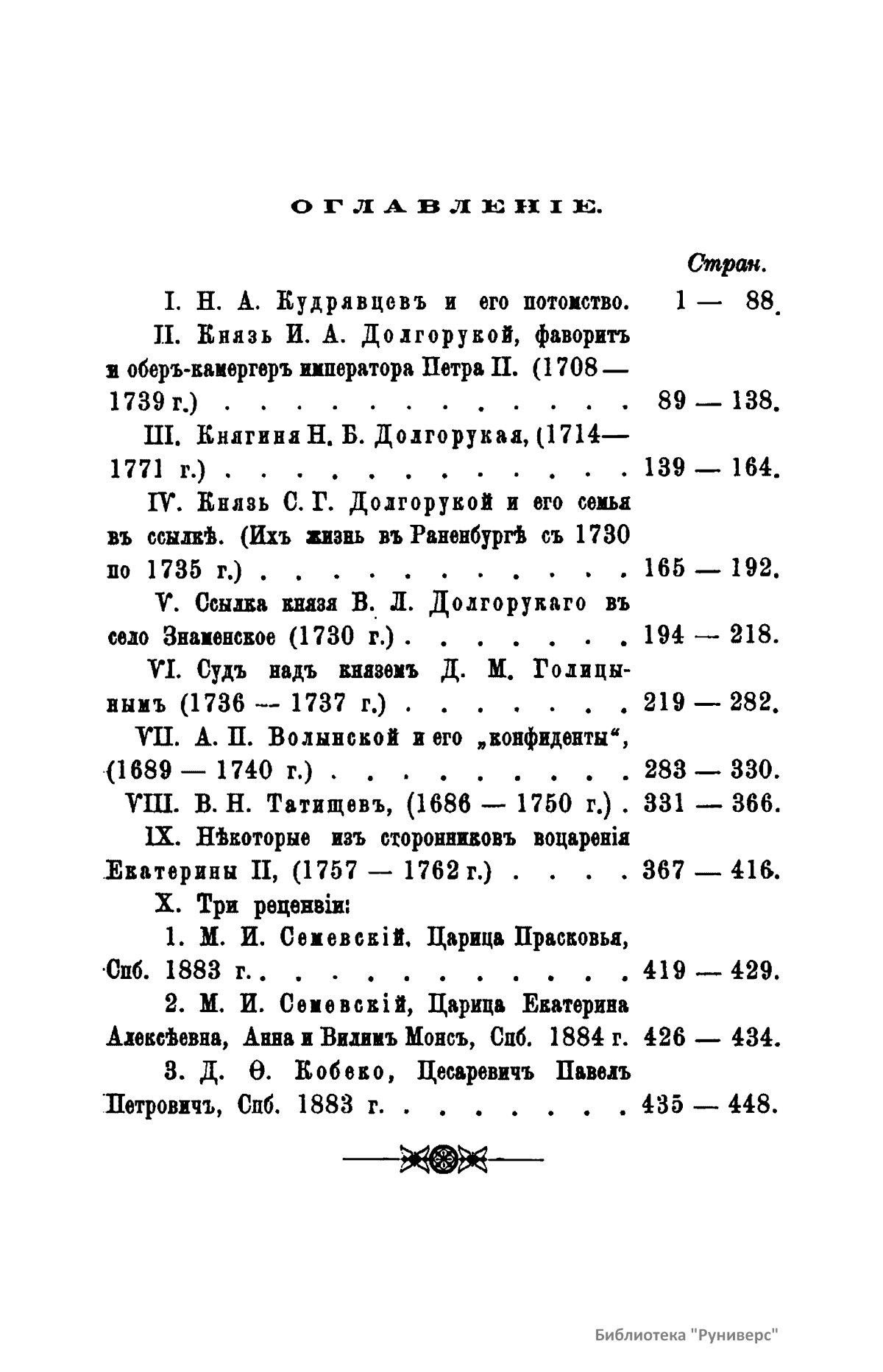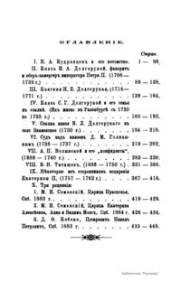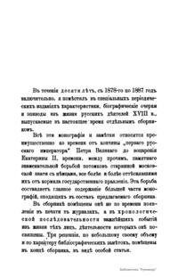 Биографические очерки и эпизоды из жизни русских деятелей XVIII века относятся к периоду от кончины Петра Великого до воцарения Екатерины II – времени памятного знаменательной борьбой потомков старинной московской знати с немцами, все более и более оттеснявшими их от кормила государственного правления. Эта борьба составляет главное содержание большей части монографий, входящих в состав предлагаемого сборника. Вниманию читателя предлагаются следующие статьи: 1. Никита Алферович Кудрявцев и его потомство. 2. Князь Иван Алексеевич Долгорукой, фаворит и обер-камергер императора Петра II, (1708 – 1739). 3. Княгиня Наталья Борисовна Долгорукая, (1714 – 1771). 4. Князь Сергей Григорьевич Долгорукой и его семья в ссылке (их жизнь в Раненбурге с 1730-го по 1735 г.). 5. Ссылка князя Василия Лукича Долгорукаго в село Знаменское, (1730). 6. Суд над князем Дмитрием Михайловичем Голицыным, (1736 – 1737). 7. Артемий Петрович Волынской и его «конфиденты», (1689 – 1740). 8. Василий Никитич Татищев, (1686 – 1750). 9. Некоторые из сторонников воцарения Екатерины II, (1757 – 1762). 10. Три рецензии: 1. М. И. Семевский. Царица Прасковья. Спб., 1883. 2. М. И. Семевский. Царица Екатерина Алексеевна, Анна и Вилим Монс. Спб., 1884. 3. Д. Ф. Кобеко. Цесаревич Павел Петрович. Спб., 1883.