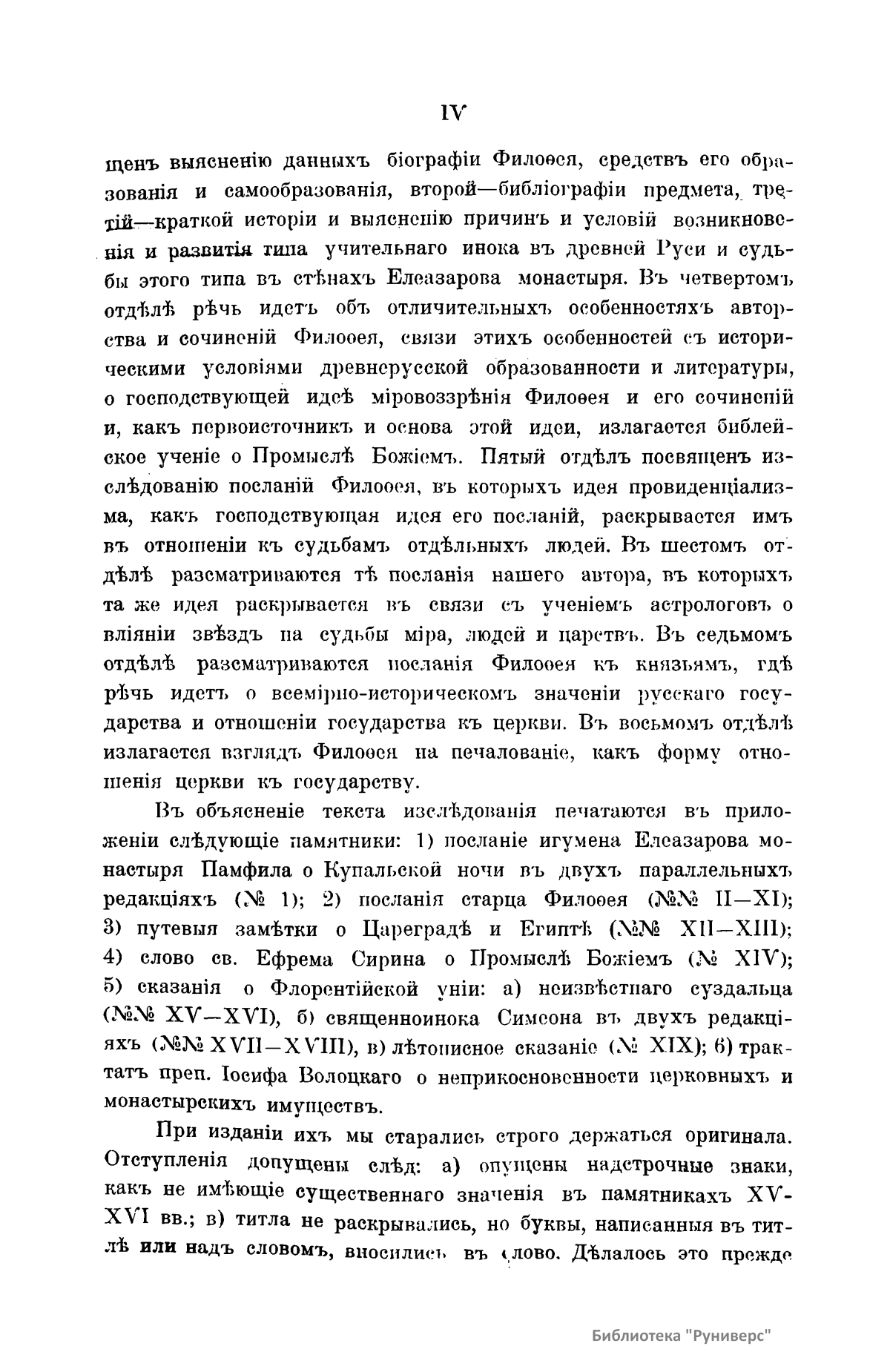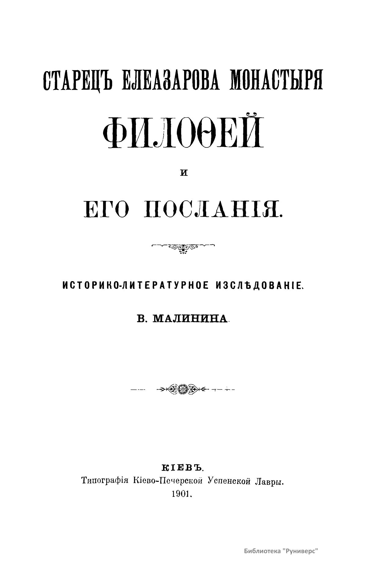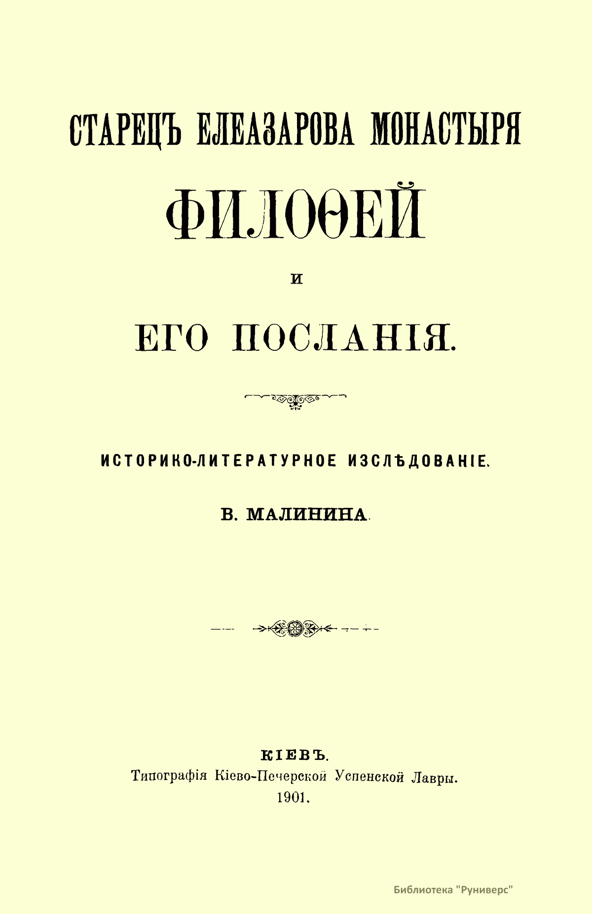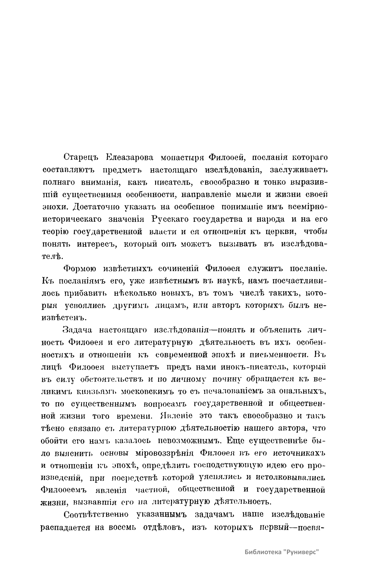 Филофей – инок-писатель (1465 – 1542), который в силу обстоятельств и по личному почину обращается к великим князьям московским то с печалованием за опальных, то по существенным вопросам государственной и общественной жизни своего времени. Задача настоящего исследования – понять и объяснить личность Филофея и его литературную деятельность. В исследовании восемь частей. Первая посвящена выяснению данных биографии Филофея. Вторая – библиографии предмета. Третья – краткой истории и выяснению причин и условий возникновения и развития типа учительного инока в Древней Руси и судьбе этого типа в стенах Елеазарова монастыря. В четвертой части речь идет об отличительных особенностях авторства и сочинений Филофея, связи этих особенностей с историческими условиями древнерусской образованности и литературы, о господствующей идее мировоззрения Филофея и его сочинений, и, как первоисточник и основа этой идеи, излагается библейское учение о Промысле Божием. Пятая часть посвящена исследованию посланий Филофея, в которых идея провиденциализма, как господствующая идея его посланий, раскрывается им в отношении к судьбам отдельных людей. В шестой части рассматриваются те послания Филофея, в которых та же идея раскрывается в связи с учением астрологов о влиянии звезд на судьбы мира, людей и царств. В седьмой части рассматриваются послания к князьям, где речь идет о всемирно-историческом значении русского государства и отношении государства к церкви. В восьмой части излагается взгляд Филофея на печалование как форму отношения церкви к государству. Подробное оглавление находится в начале книги.